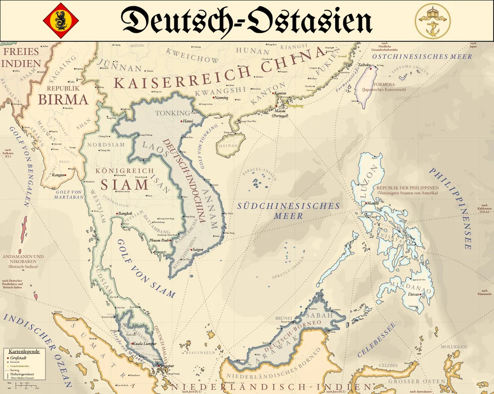 German East Asia (German: Deutsch-Ostasien), is a German colony in East Asia under the authority of German Ostasienflotte based on Singapur. Ostasien is comprised of Imperial protectorates, colonies, and concessions in the Far East, including Malaya, Indochina, Sarawak, New Guinea, Guangzhouwan, Weihaiwei, Qingdao and the Pacific Islands.