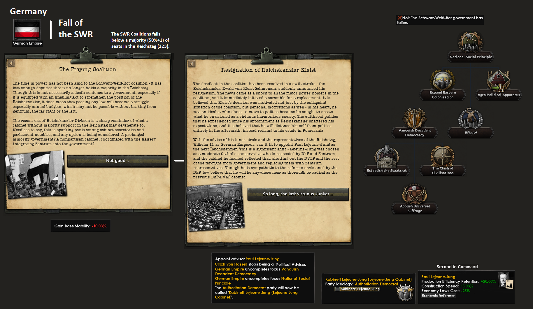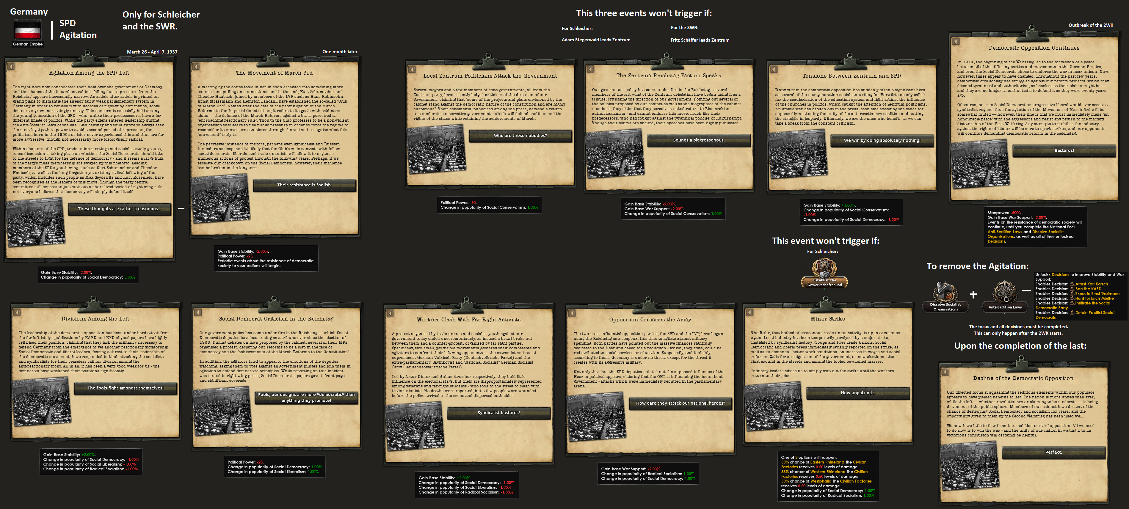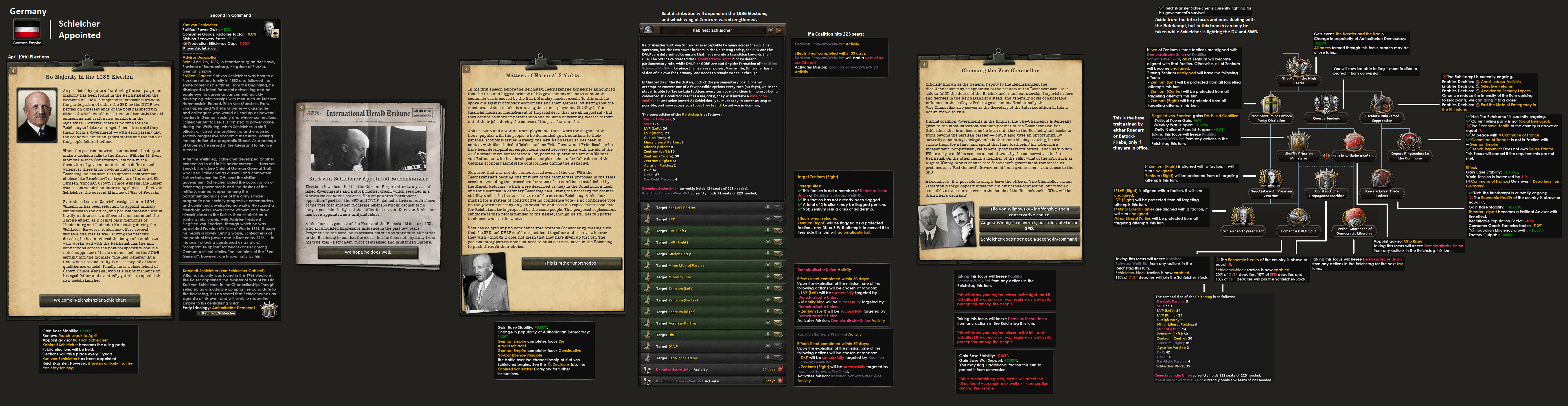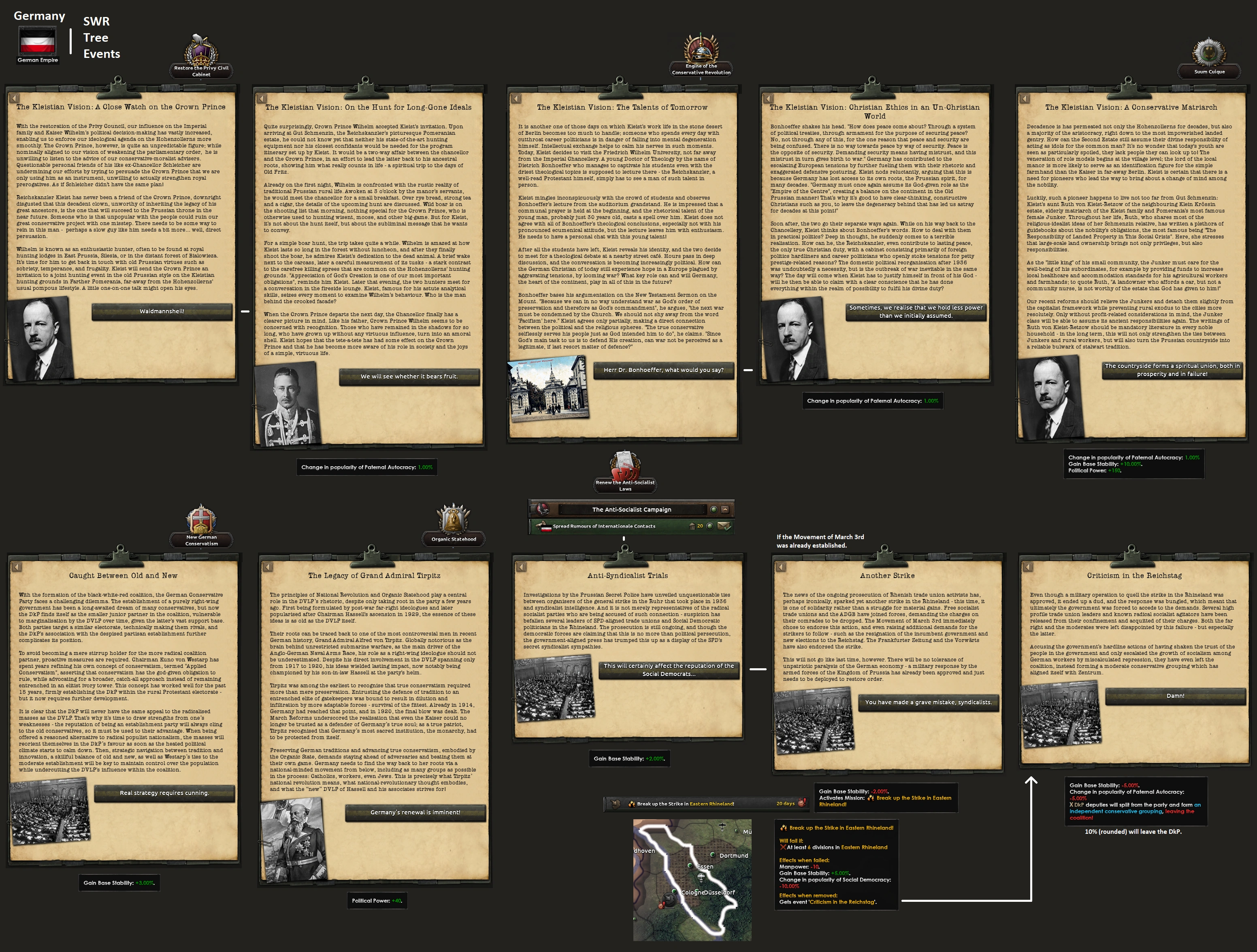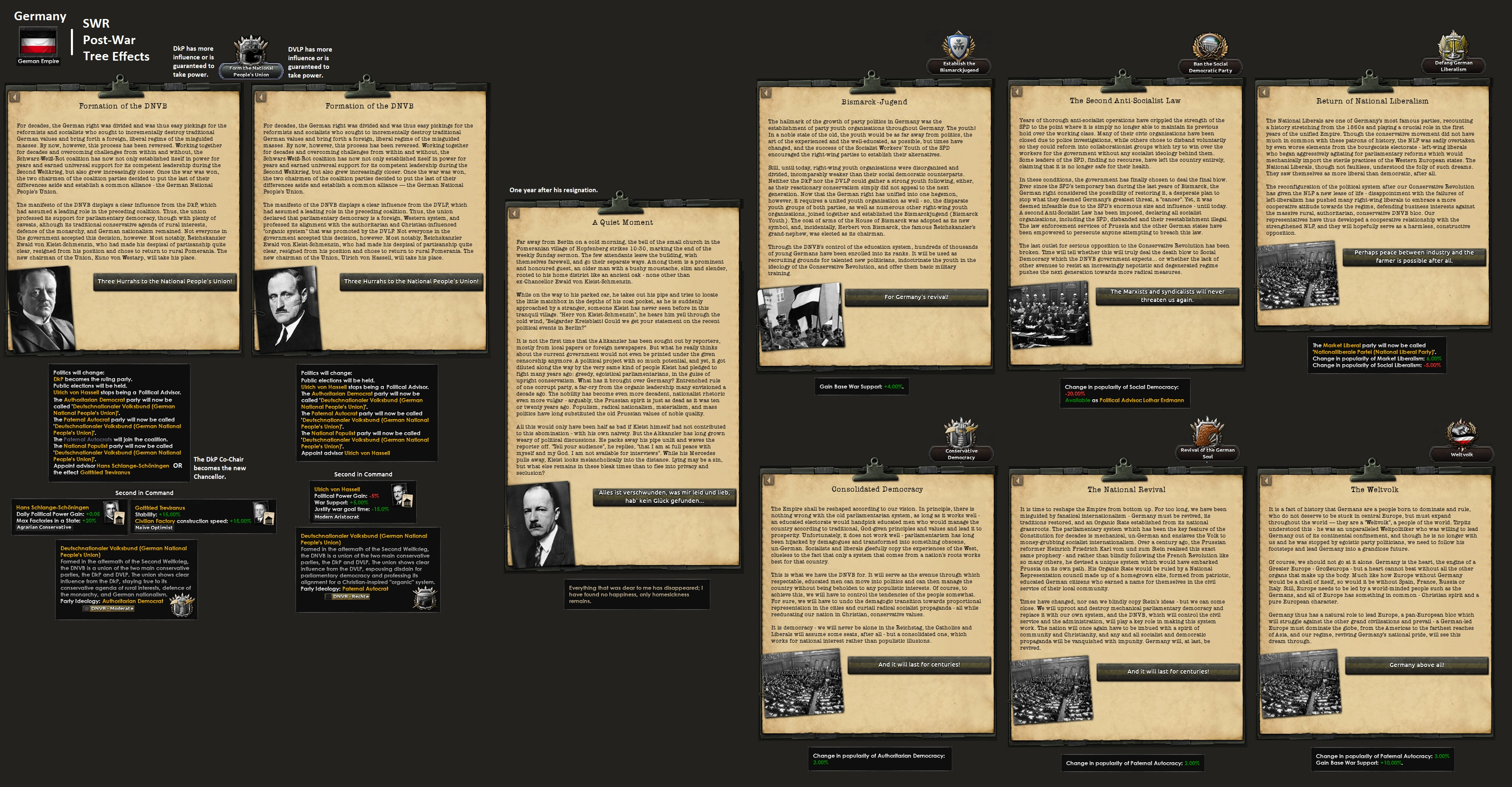 In addition to the decisions a number of events and foci will affect the growth of the DU/SWR, some unavoidable. For example, about two months from the start of the Schleicher mini-game, the DkP will join the SWR if it has not done so already. Just over two months from that, Zentrum (Right) will also join the SWR unless the foci Shuffle Prussian Ministries or Negotiate with Prussian Zentrum has been completed.
