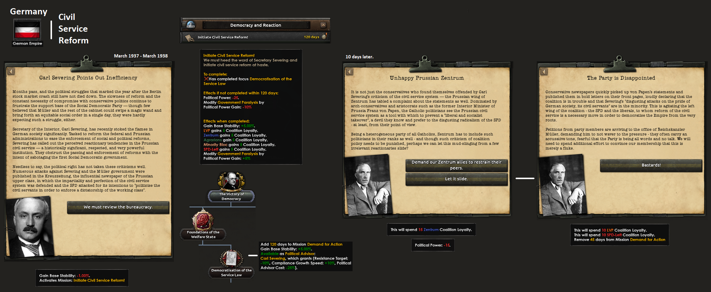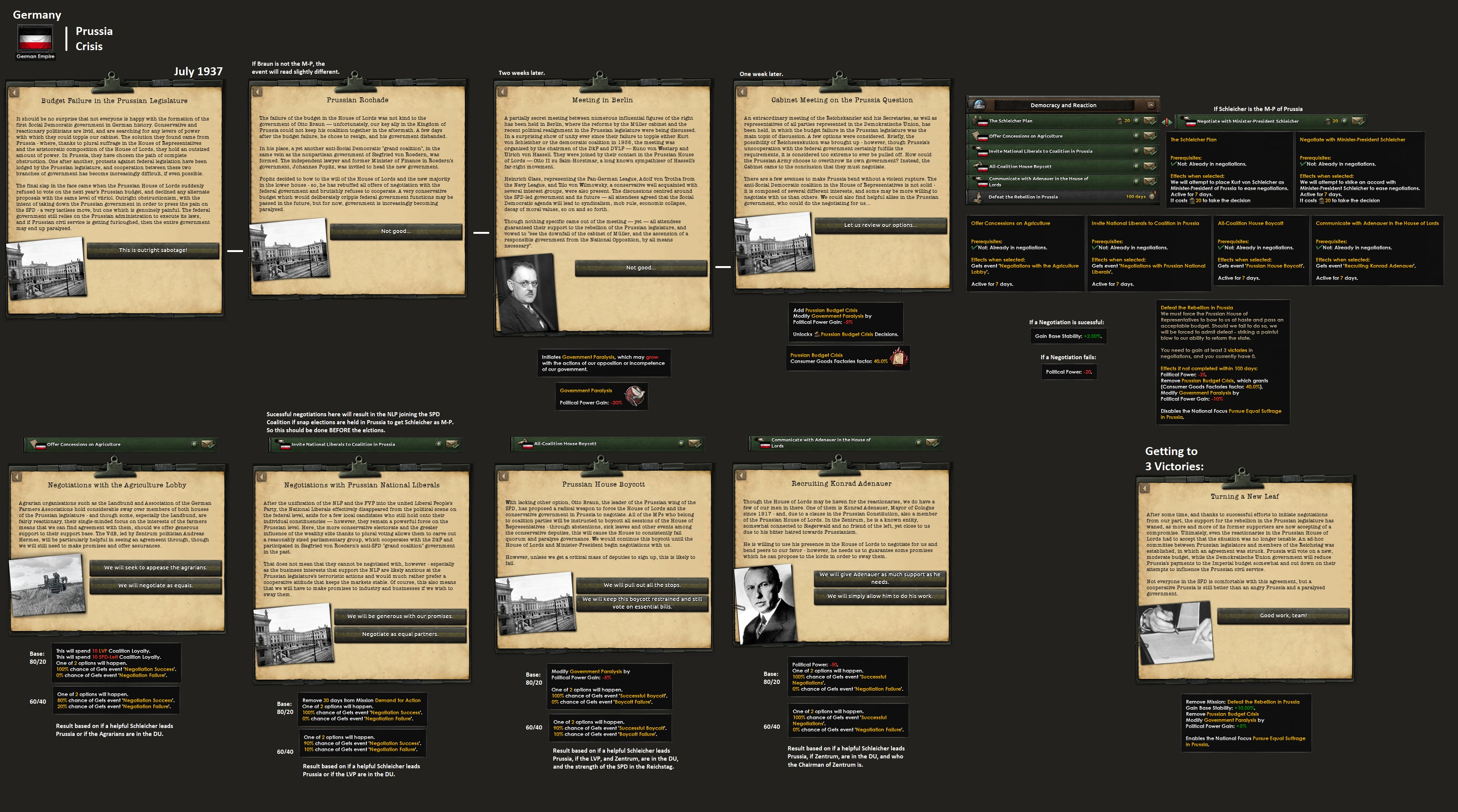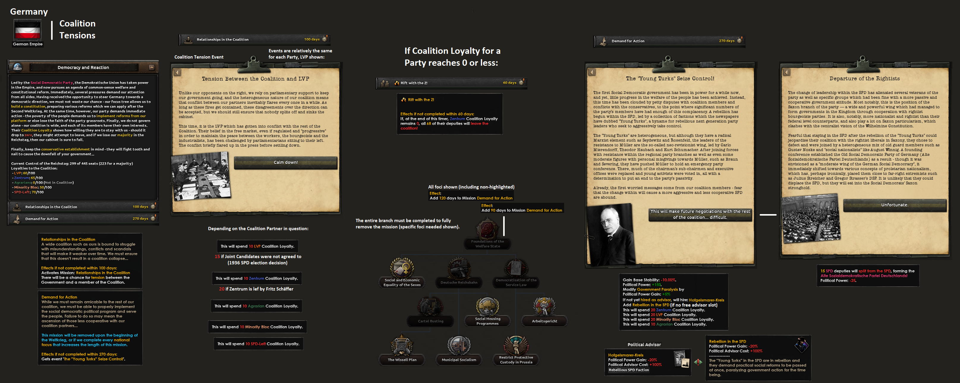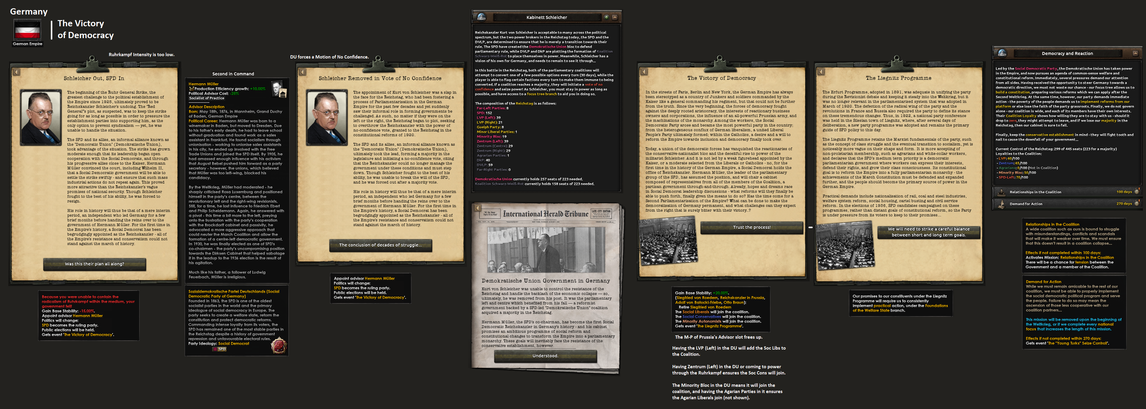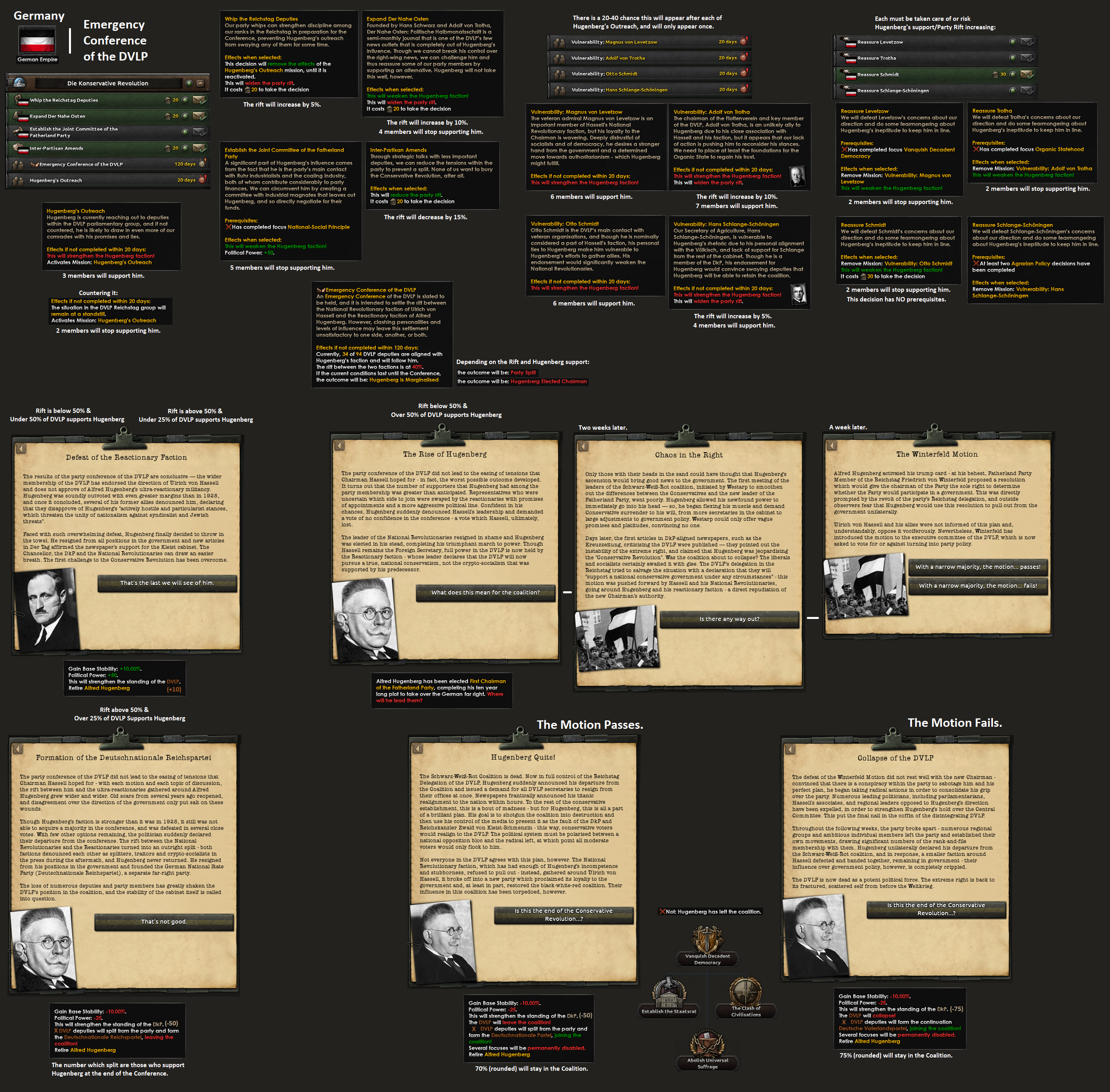 In addition to the decisions a number of events and foci will affect the growth of the DU/SWR, some unavoidable. For example, about two months from the start of the Schleicher mini-game, the DkP will join the SWR if it has not done so already. Just over two months from that, Zentrum (Right) will also join the SWR unless the foci Shuffle Prussian Ministries or Negotiate with Prussian Zentrum has been completed.