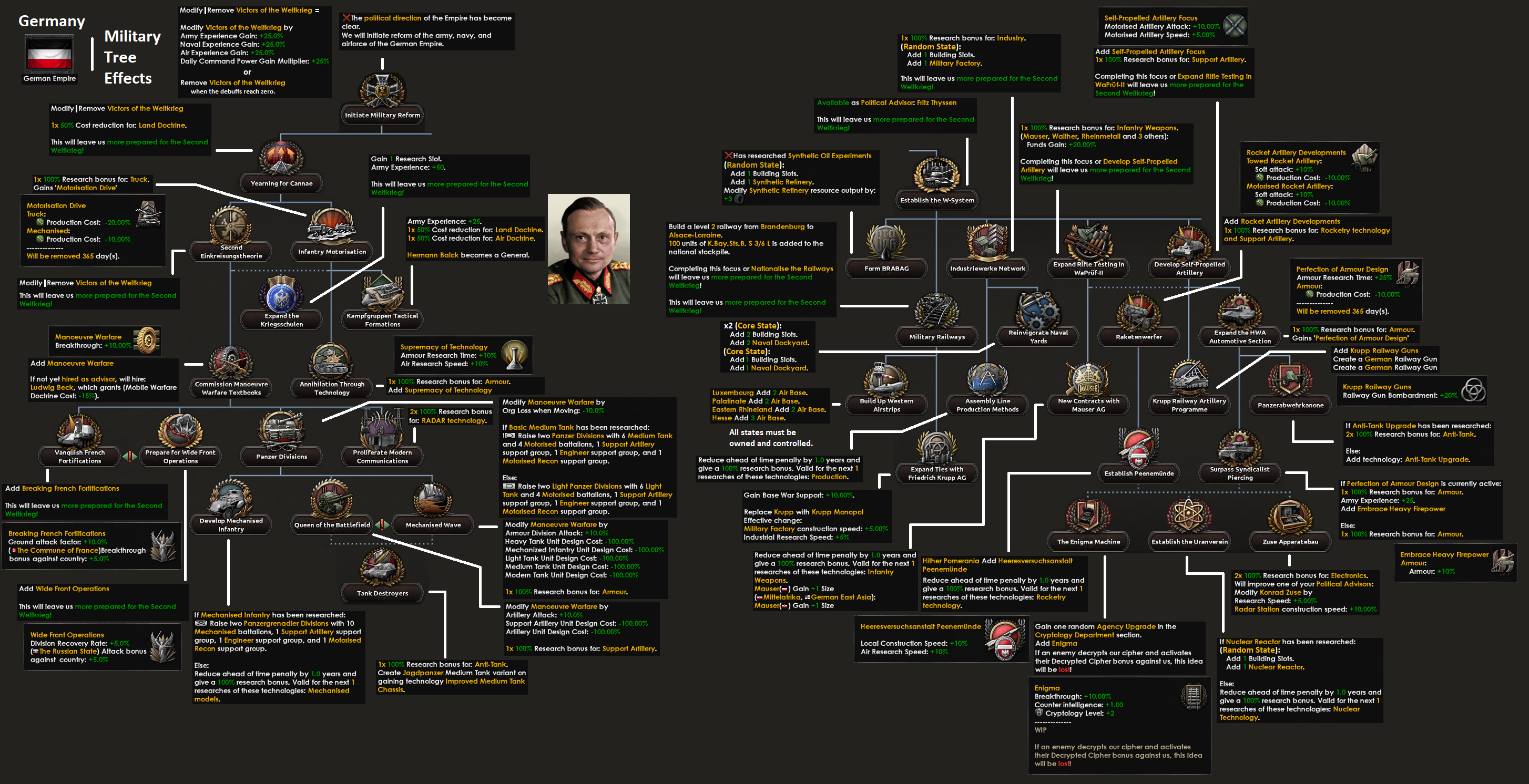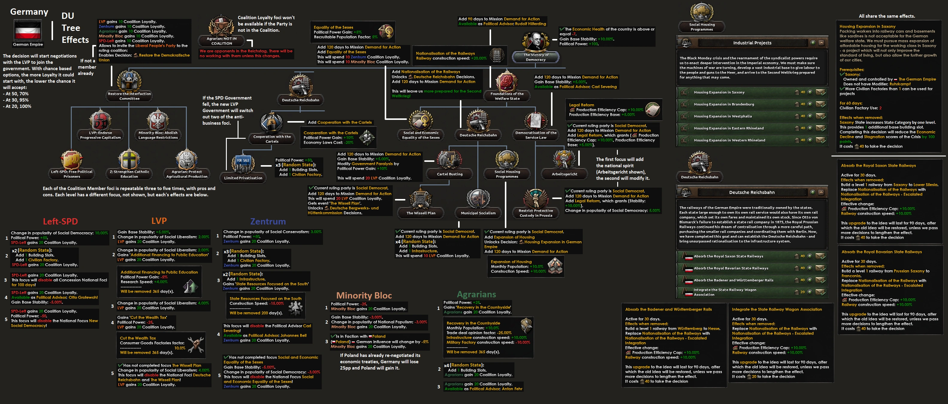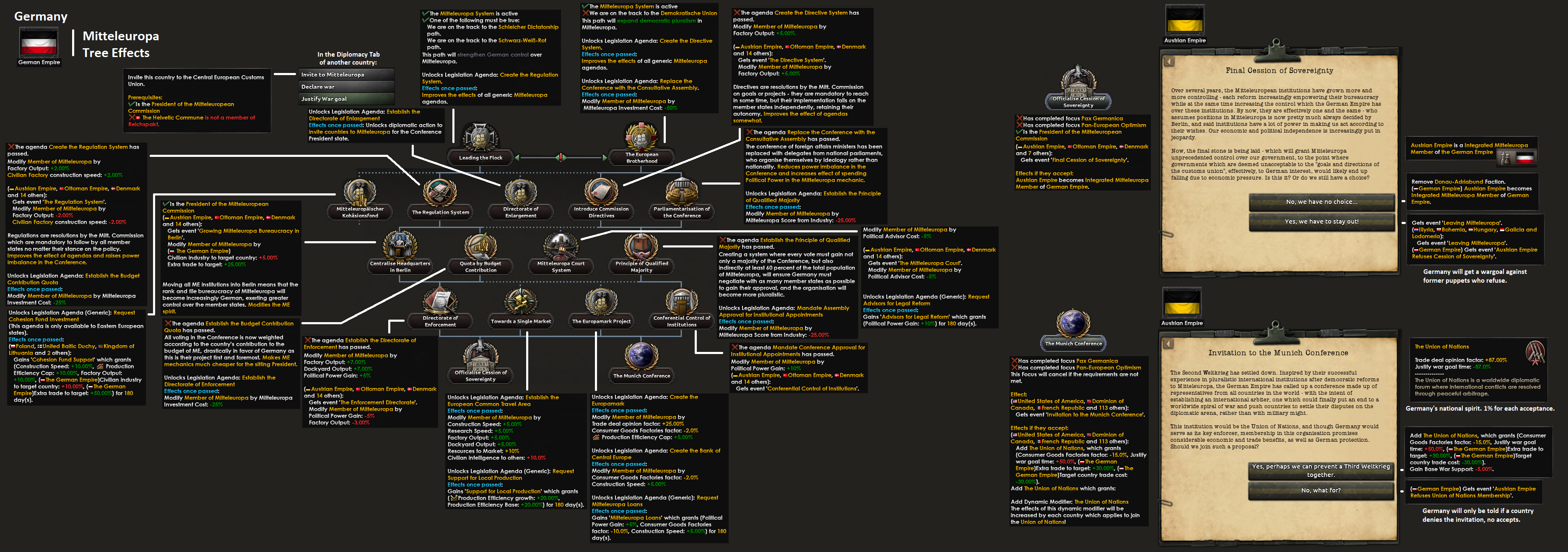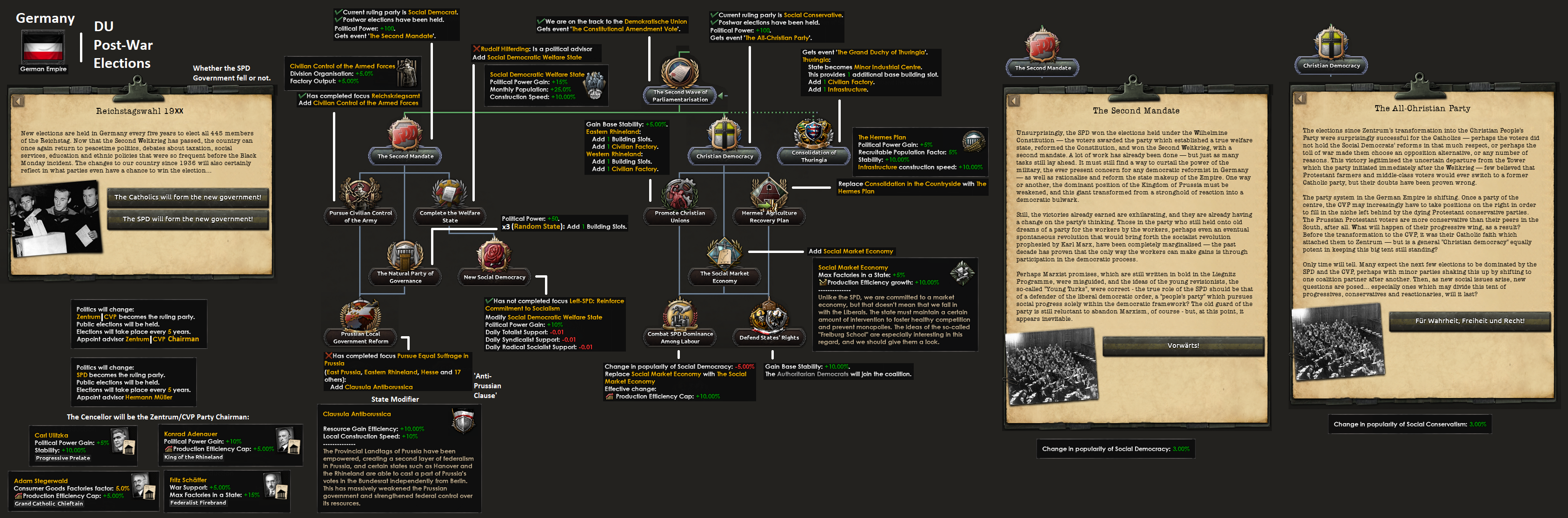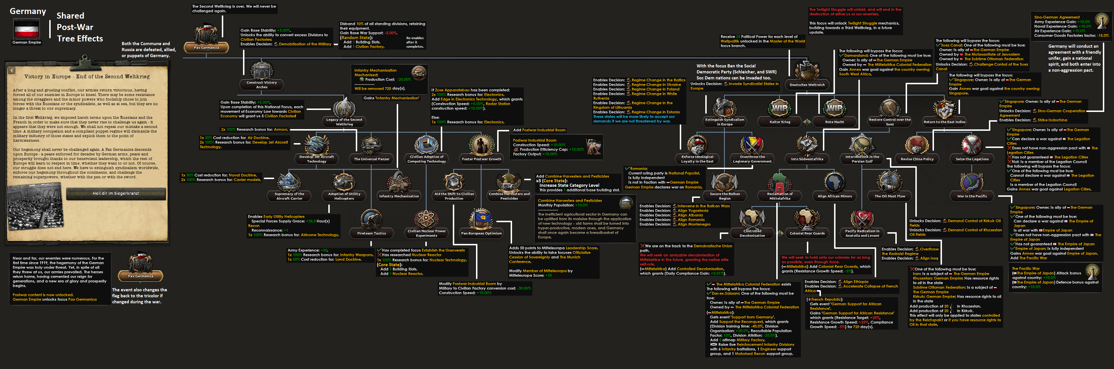 The 2WK will be considered over when both the Commune of France and Russia are defeated (ie. capitulated), or are either allies of or puppets of Germany. The Post-War focus tree is divided into four parts: the occupation of Europe on the left, then the political sub-branches, a sub-branch on the post-war economy, and finally the post-war foreign policy branch.
