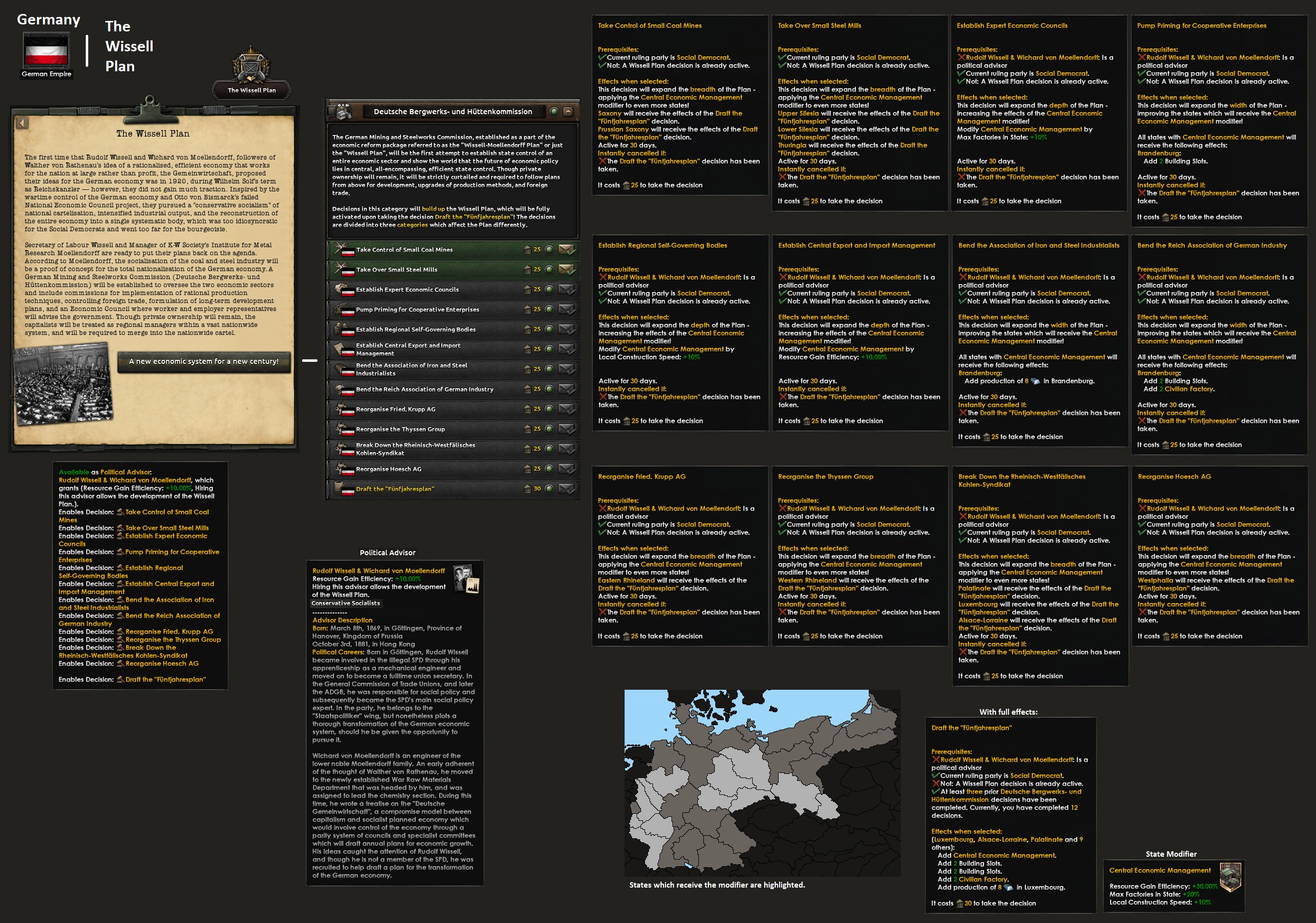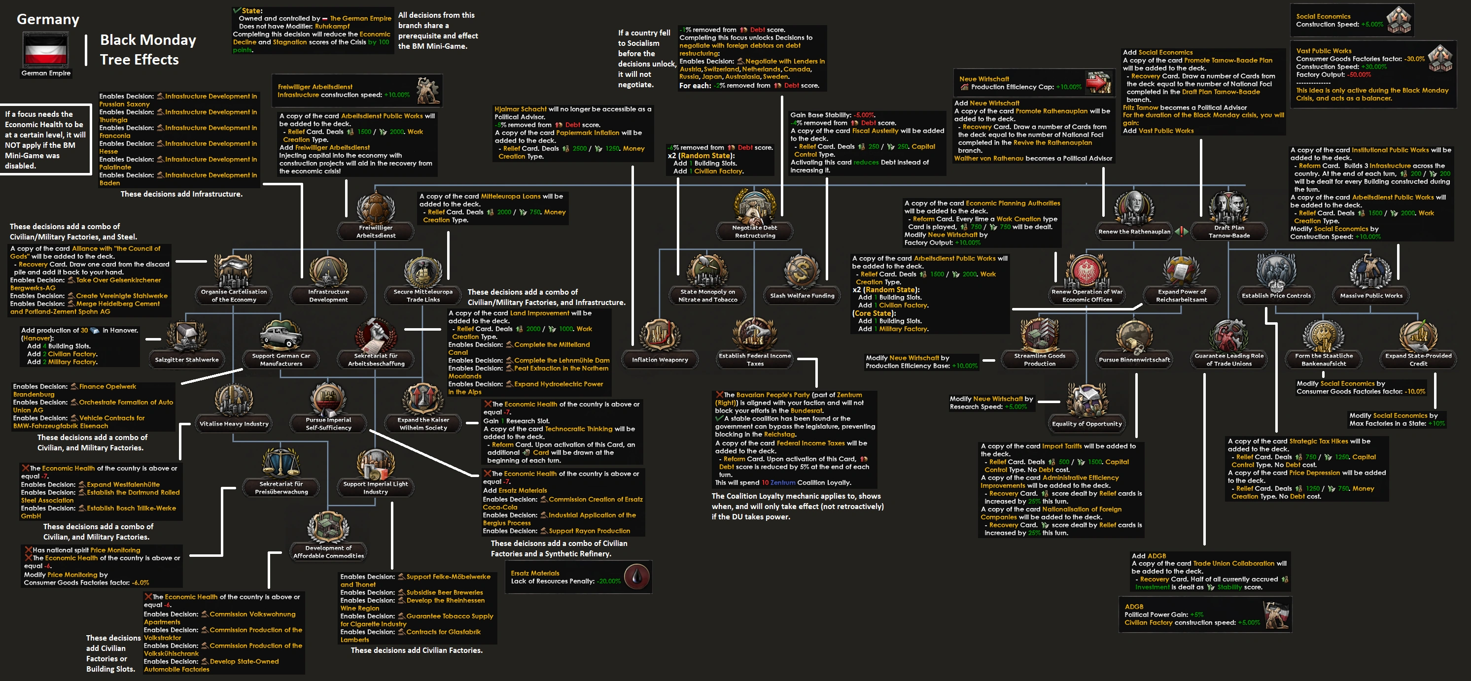 The next branch deals with debt restructuring. The foci in this branch, and the decisions enabled through its first focus, are the best way to reduce Black Monday debt. Germany can negotiate with lenders from Austria, Switzerland, the Netherlands, Canada, Russia, Japan, Australasia, and Sweden via said decisions, shaving 2% off the Black Monday debt for each. However, it cannot take these decisions if a country falls to socialism before Germany can negotiate.