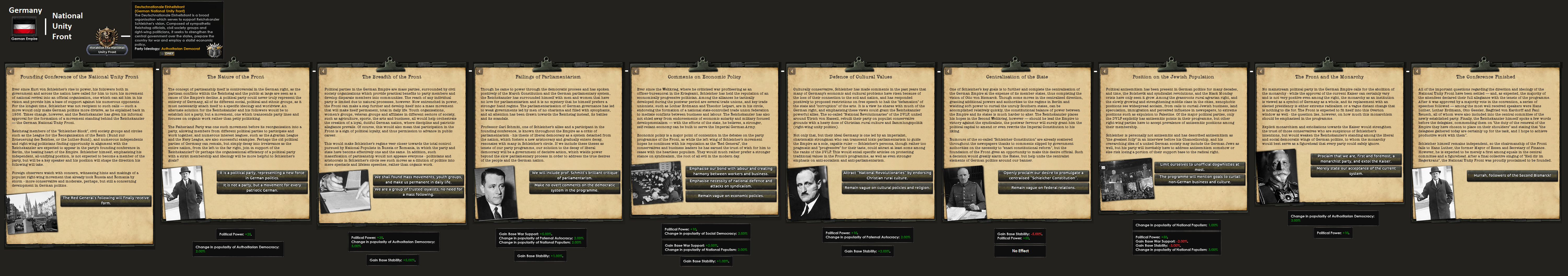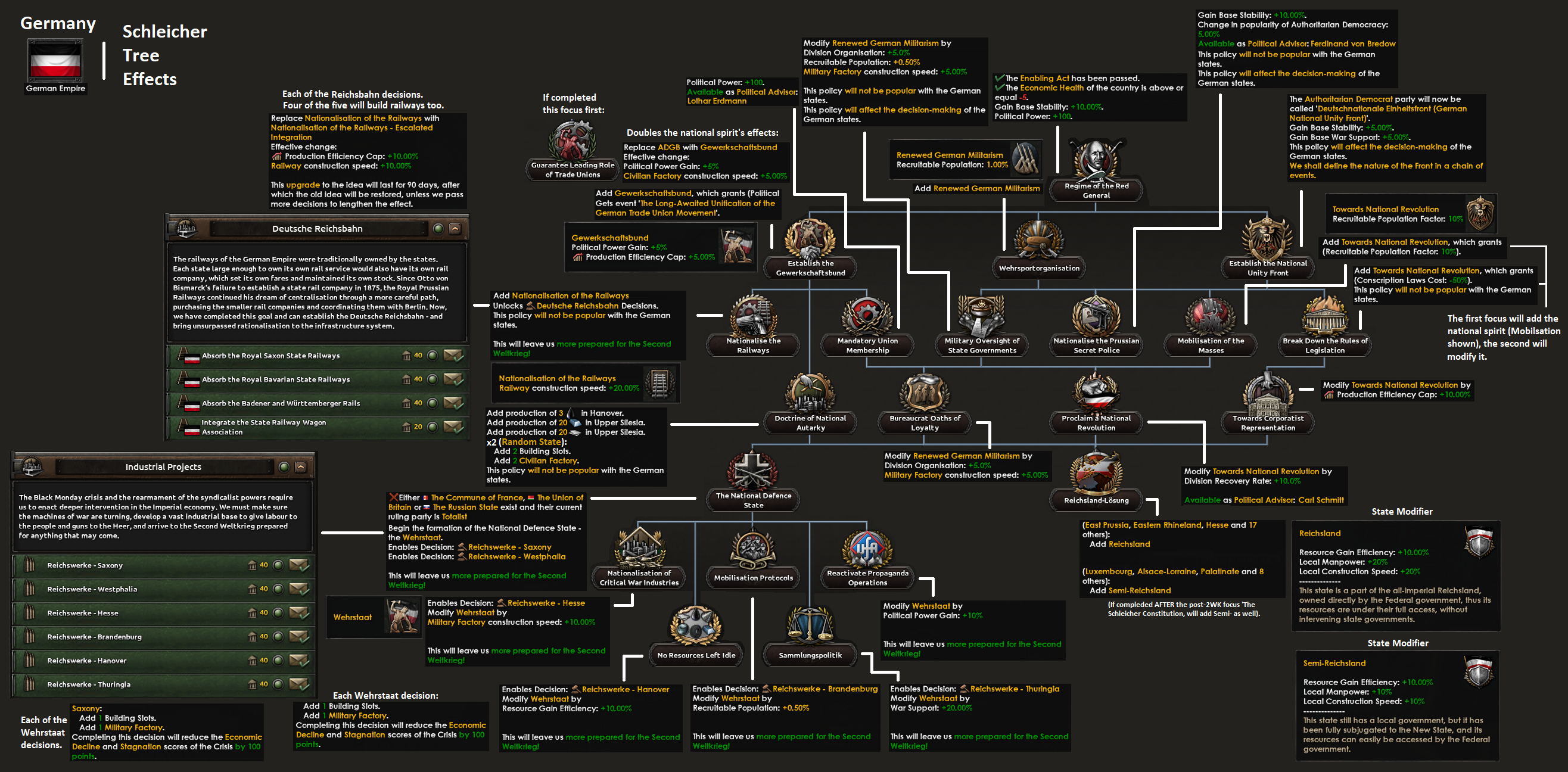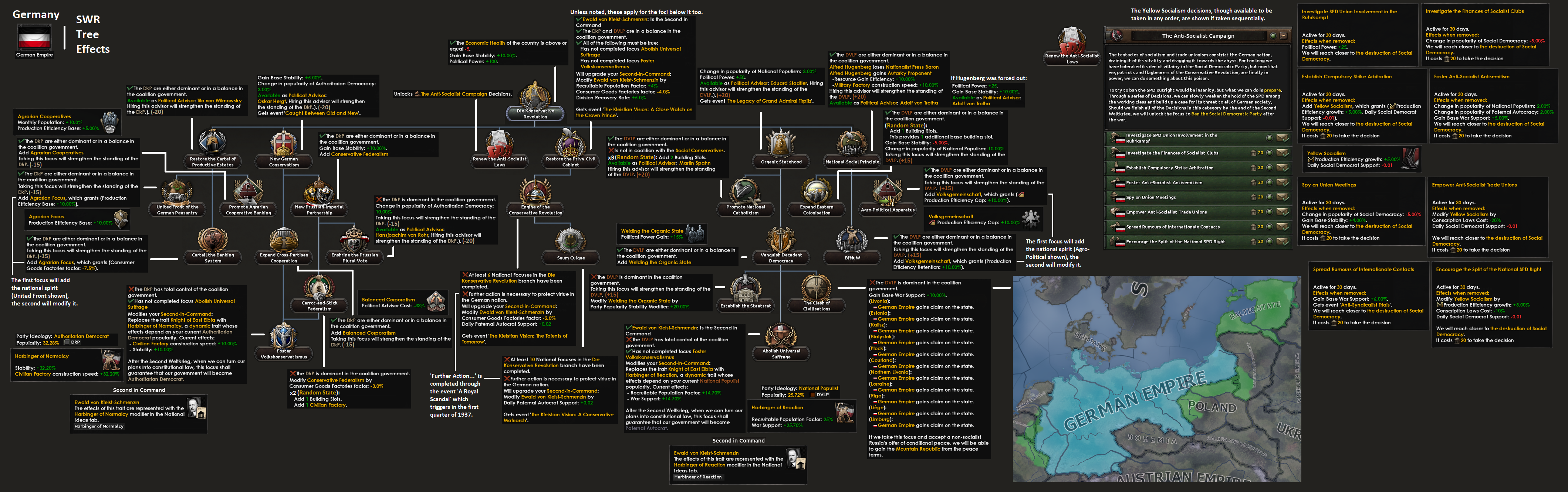 Concerning foreign policy, this branch can be broken down into four branches. On the left, Germany will be able to defeat any leftover socialist nations (Rad Soc, Syndie, or Totalist) by getting wargoals against them. If Schleicher or the SWR also completed the focus Proclaim Death of German Syndicalism, Germany will also get decisions to attack unaligned Soc Dem countries too. Also in the branch, any unfriendly governments of its eastern puppets may be overthrown and replaced by a more receptive one, the Romanian Iron Guard attacked, and the nations of the Balkans can be invited into the Reichspakt.