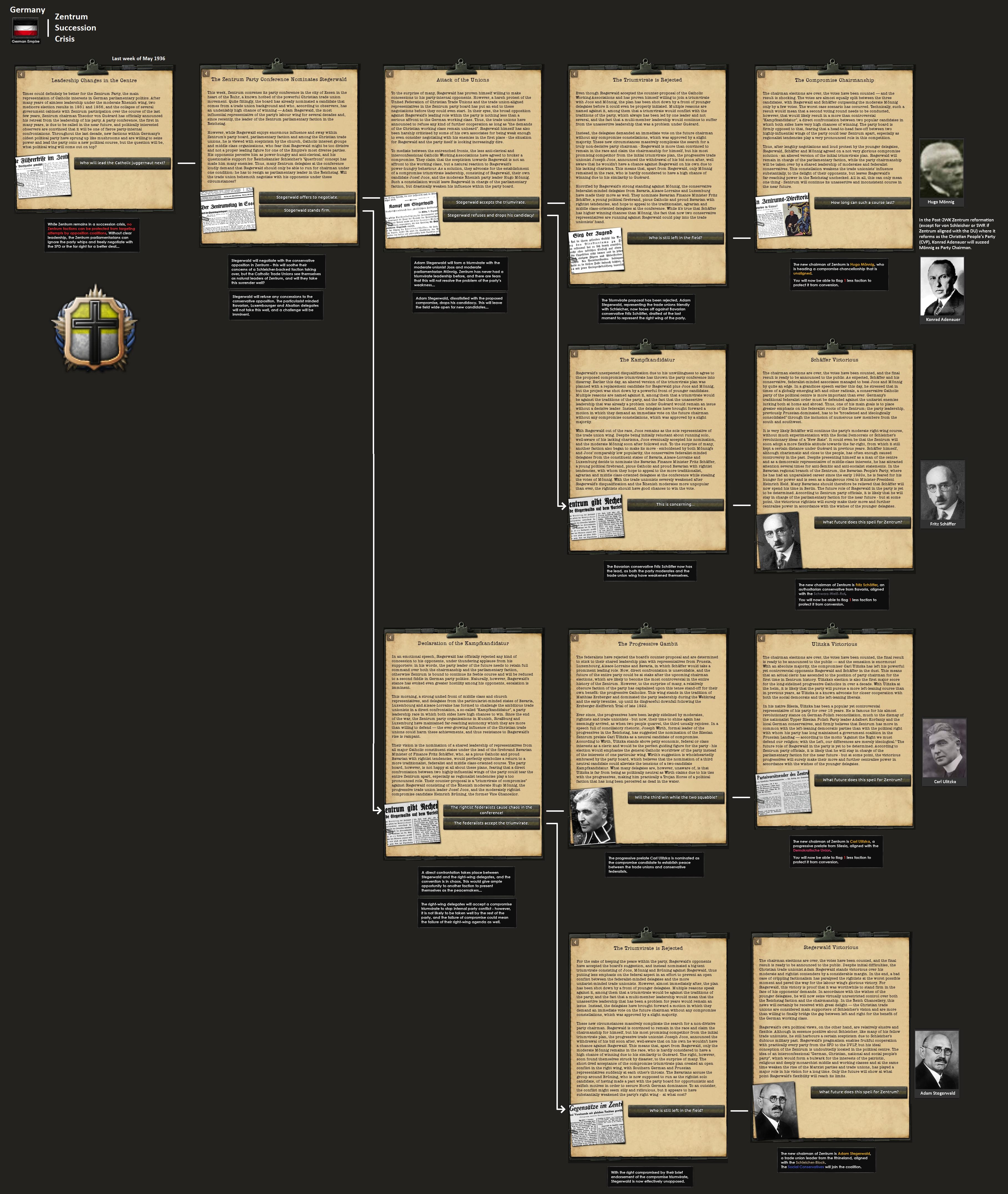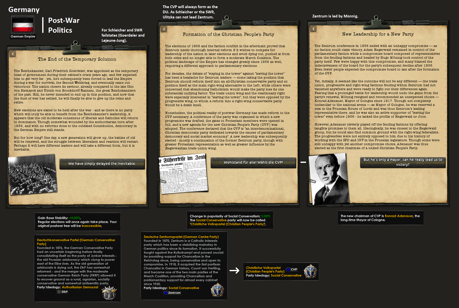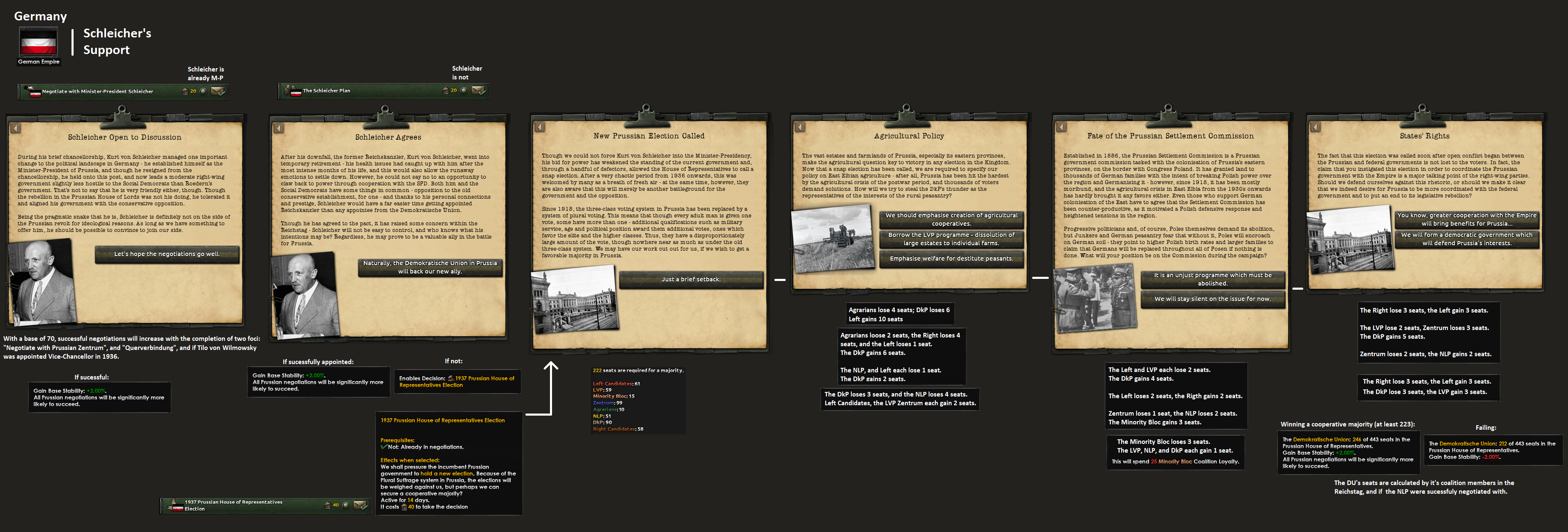 The Man in the High Castle branch does not just help prevent Zentrum from falling under the DU/SWR. Schleicher can, with two foci (Construct the Propaganda Machine, and Forment a DVLP Split) create his own faction in the Reichstag, the Schleicher-Bloc. For the former, 20% of the DVLP, 10% of the SPD, and of the DkP will join; for the latter, 15% of the DVLP will join.