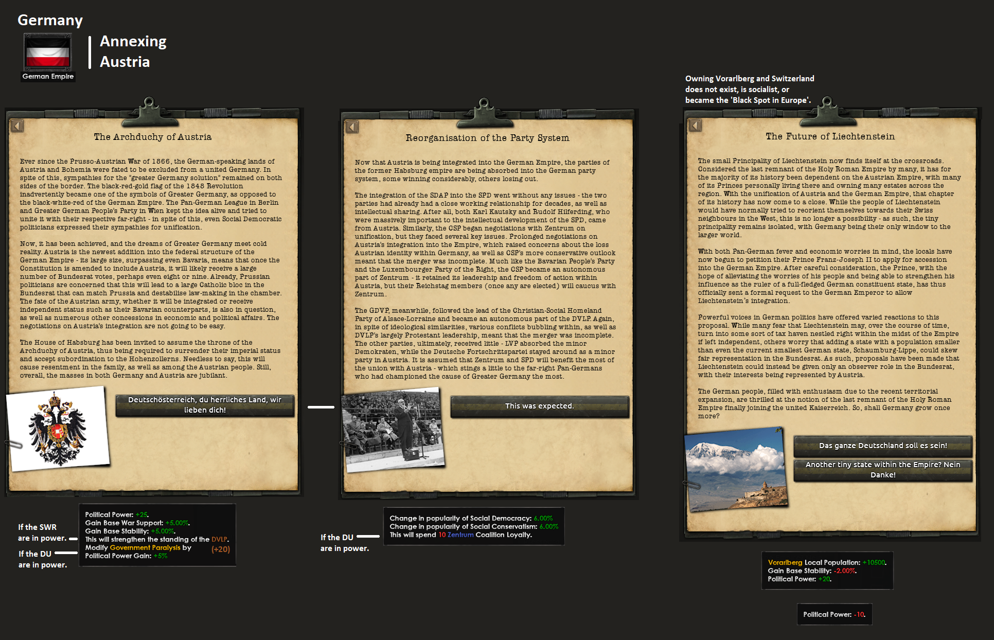 If Germany annexes the Austrian Empire, whether that be from military action or at its request (Austria gets a decision in its Military Occupation Path), Austria will be integrated into the German Empire. The Empire has no room for two Emperors, or even another King, so Kaiser Karl or his son Otto will have to make due as an Arch-duke. Austria will become the Empire’s 28th constituent state and its own Arch-Duchy. As a state it will be represented in the Bundesrat, and will be allocated 8 or 9 votes.