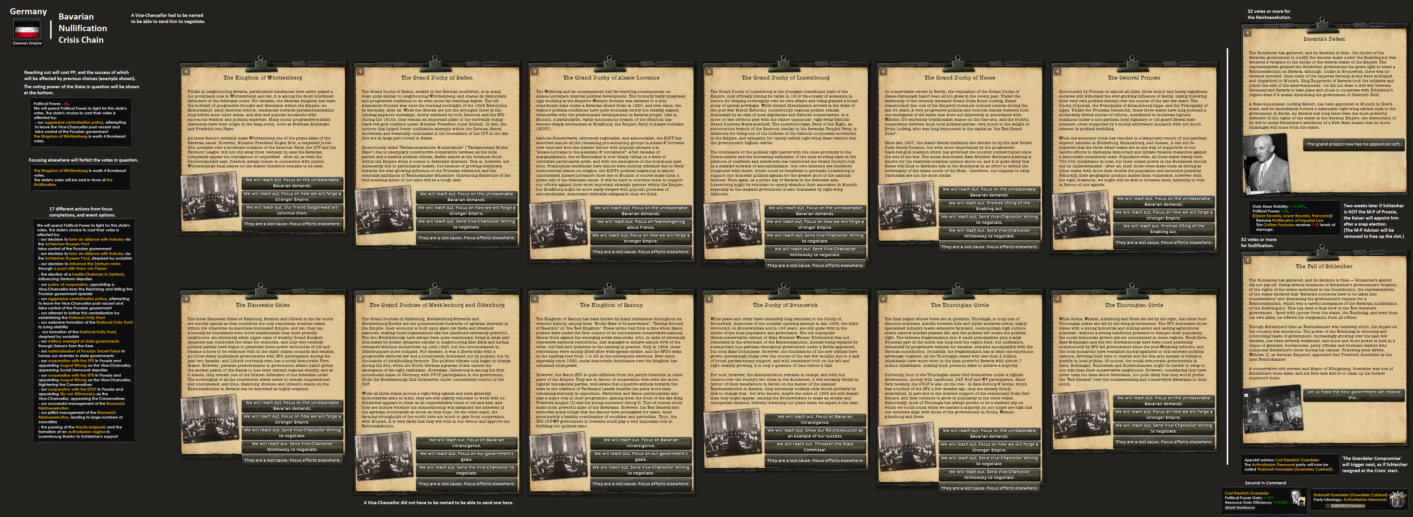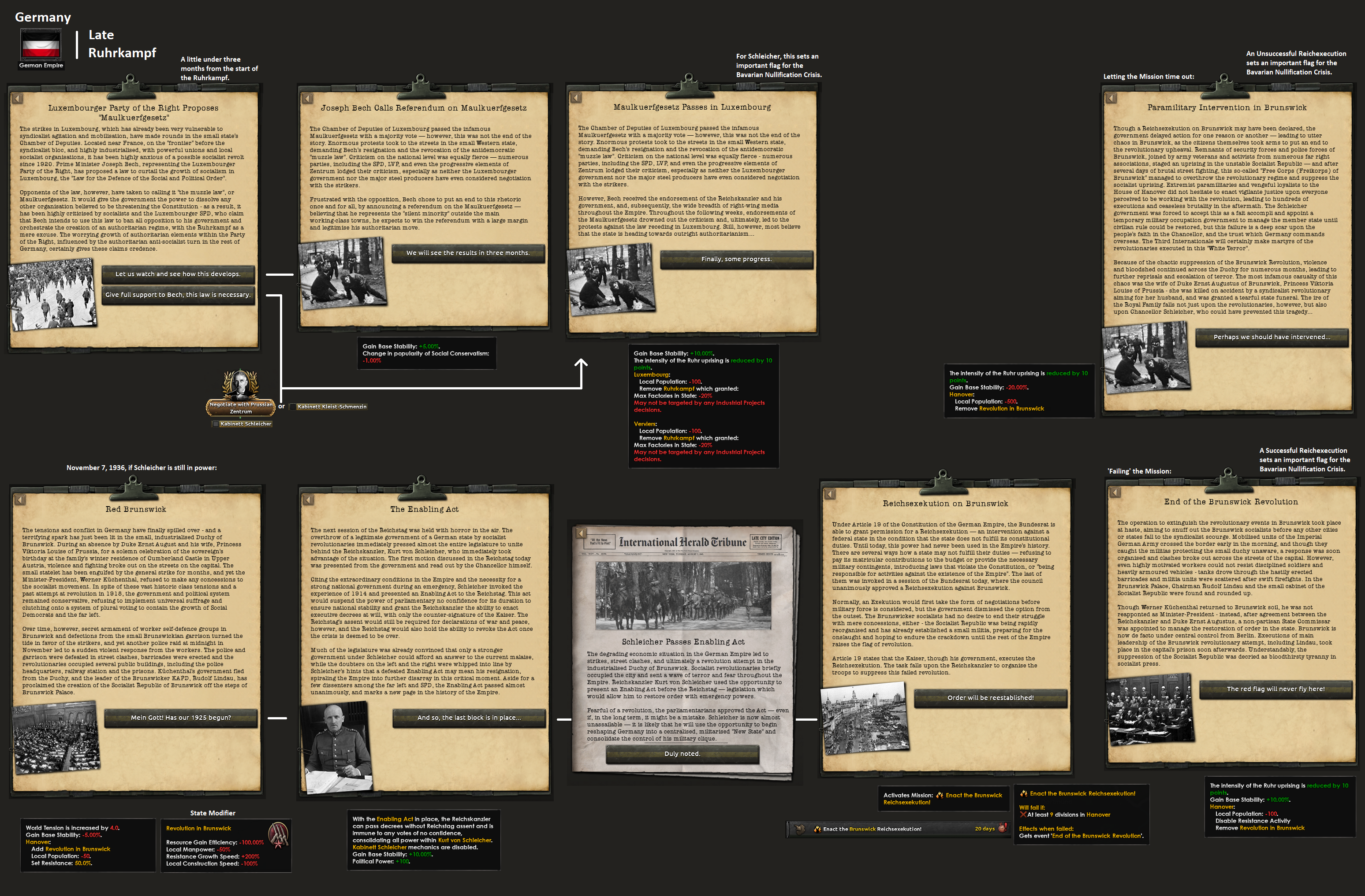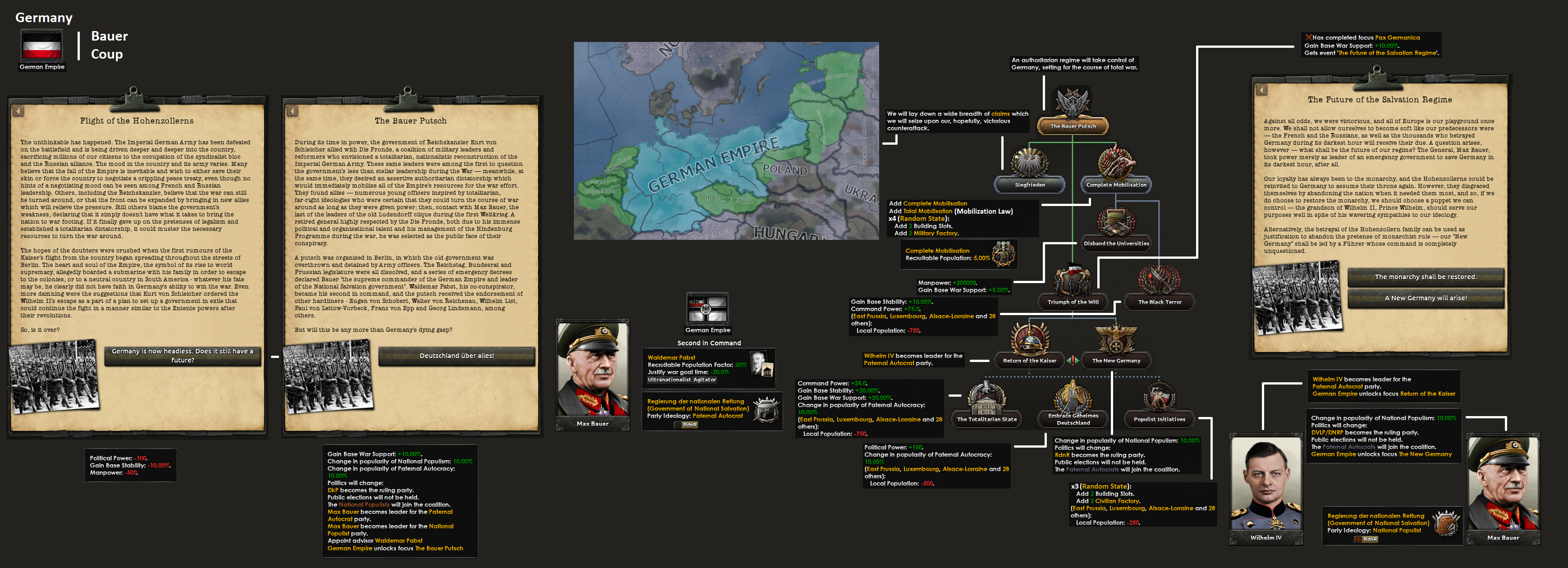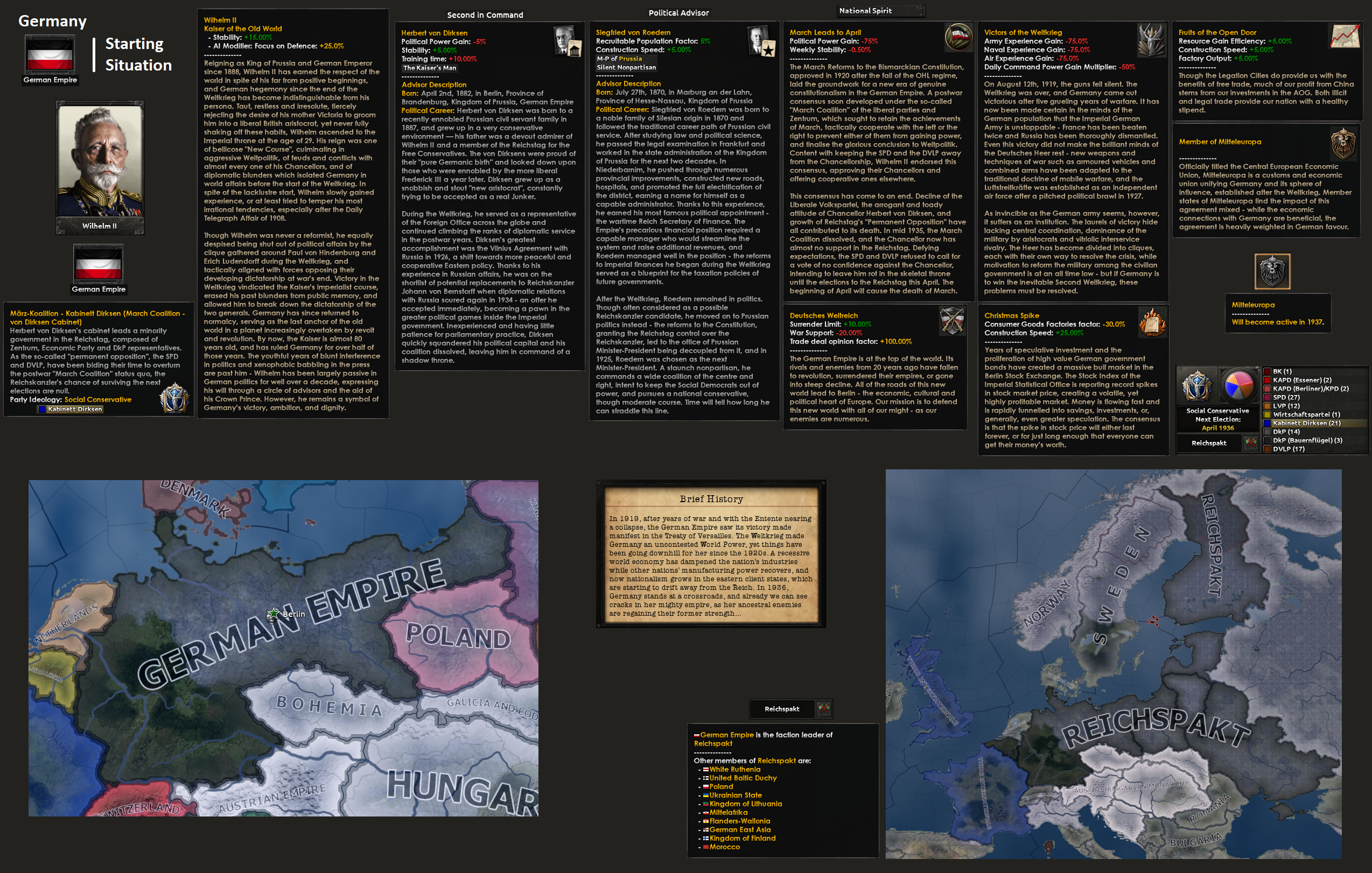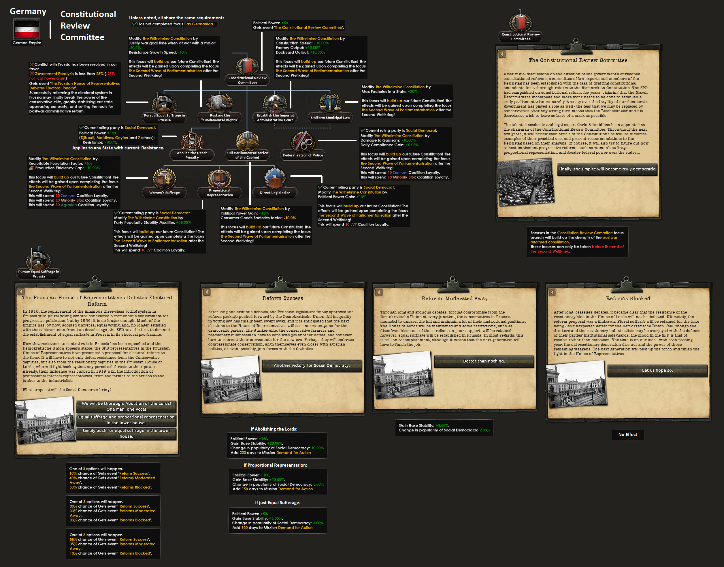 If Müller is able to turn things around and actually defeats the Commune and Russia, a new Constitution will be promulgated after the war. Like the Wilhelmine Constitution, the effects will depend on how many of the Constitution foci were completed before the end of the 2WK. There will be only one event, and it will give the Constitution of the German Republic national spirit.