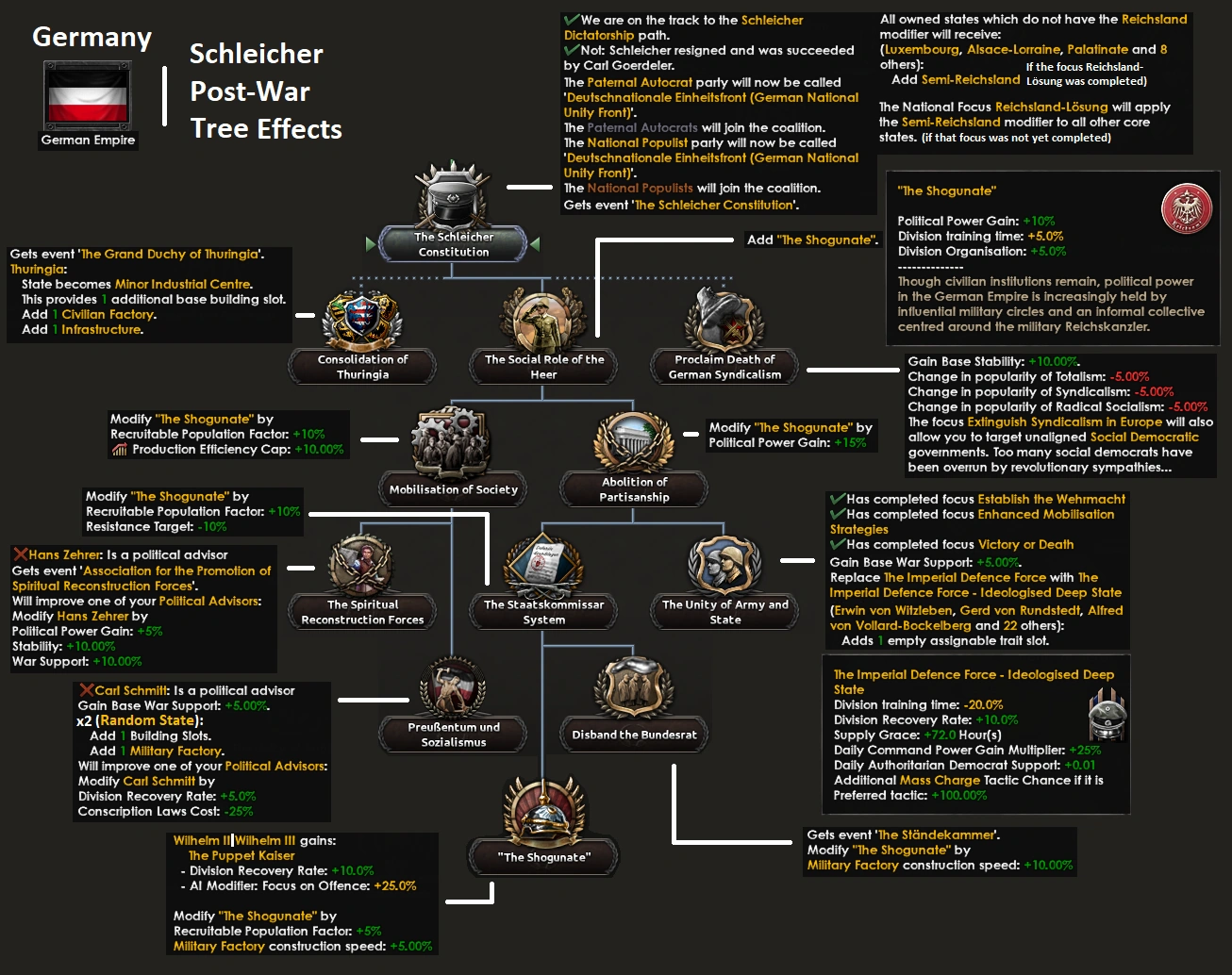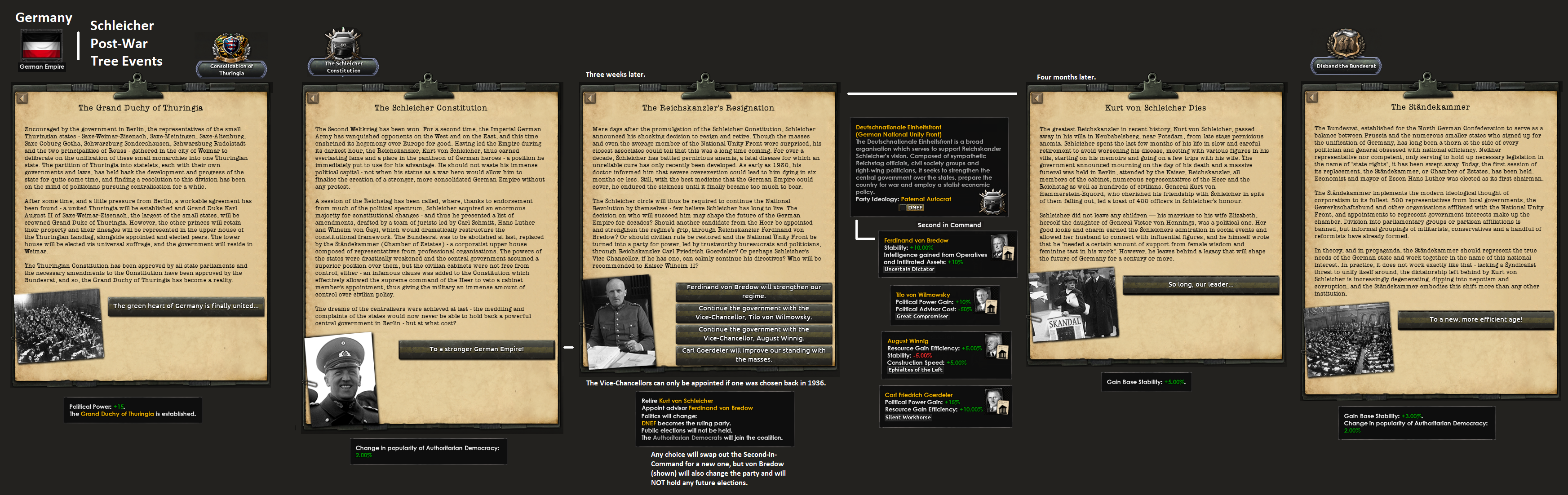 - Postwar, after the Schleicher Constitution is passed, Schleicher will retire and a new Reichskanzler will succeed him. Depending on his successor, you will either remain Authoritarian Democrat or become Paternal Autocrat.