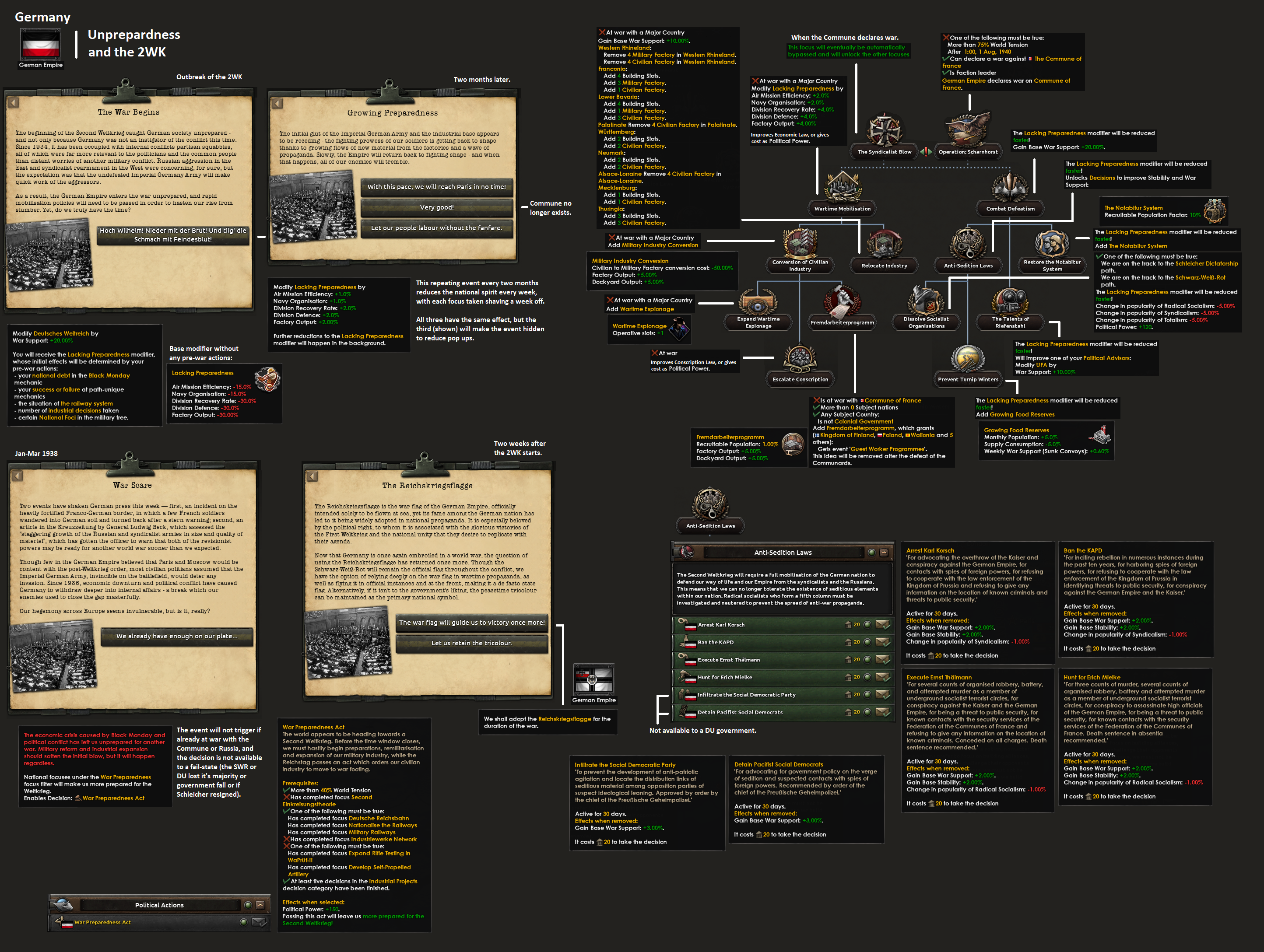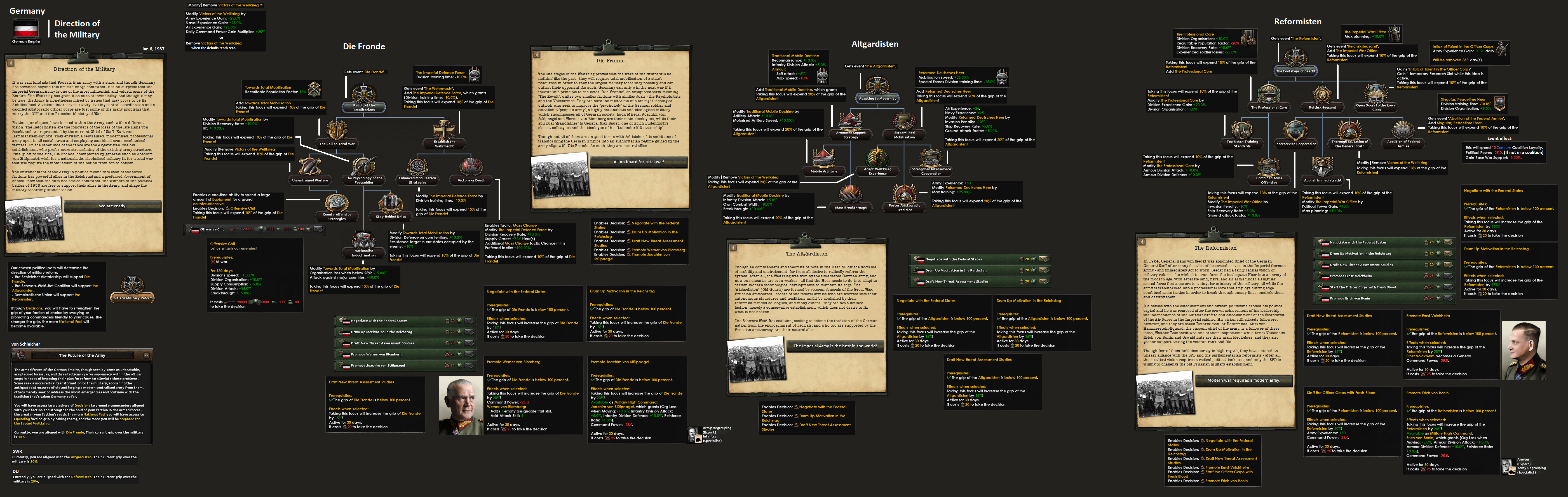 Another branch deals with the Commune of France. The first focus in it will ask the Commune to renew the Treaty of Metz. The Treaty, signed after it won the French Civil War, holds the Commune to the Treaty of Versailles and demilitarizes its side of the border. The French can save face and agree, lowering world tension, or can publicly deny it and lose war support (the earlier the focus is completed, the more war support it will lose). In an effort to encircle the French, Germany can build up its fortifications on the French border, look to Spain and Austria for mutual help, and will get decisions to invade/align unfriendly northern and eastern neighbors.