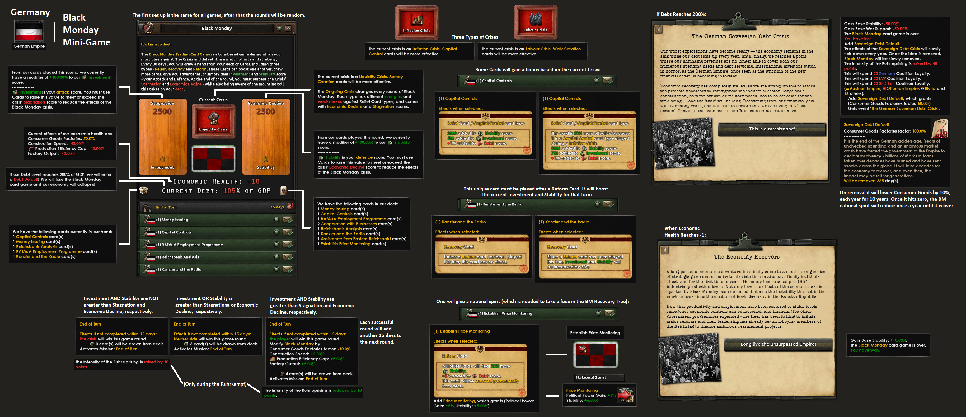 If all the rounds are successfully beaten the first time around, the Black Monday mini-game will end in February 1938, the economy taking a full two years to recover. If the mini-game keeps going until the start of the 2WK, it will end in a draw and BM will slowly tick down, every 150 days, until the economy finally recovers.