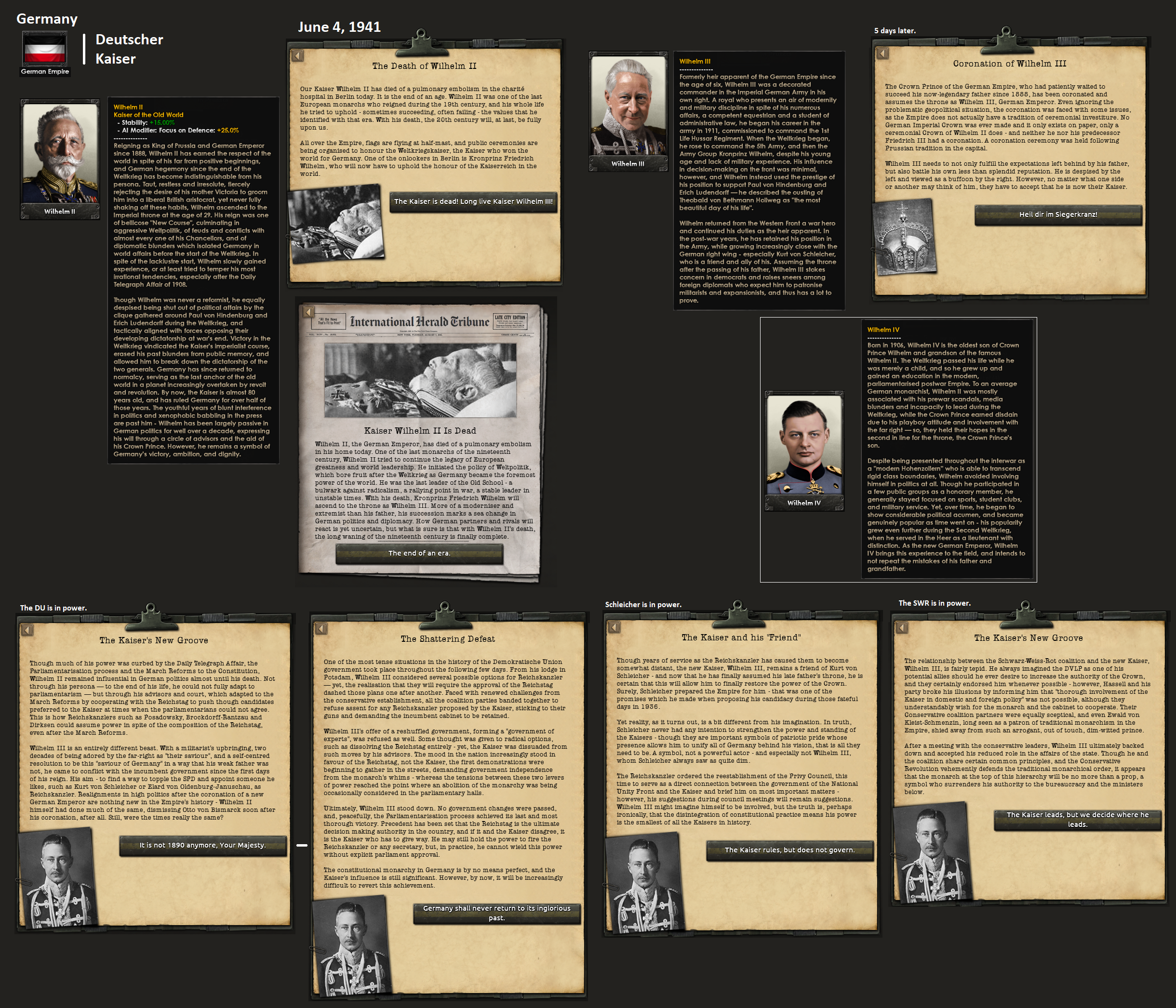 Wilhelm II and III are the only two available Kaisers in normal gameplay. Wilhelm III’s son, Wilhelm IV may come to power via the Bauer Coup if the putschists decide to restore the monarchy, or via the Republic if he wins the presidential election and accepts the referendum held on the restoration of the monarchy.