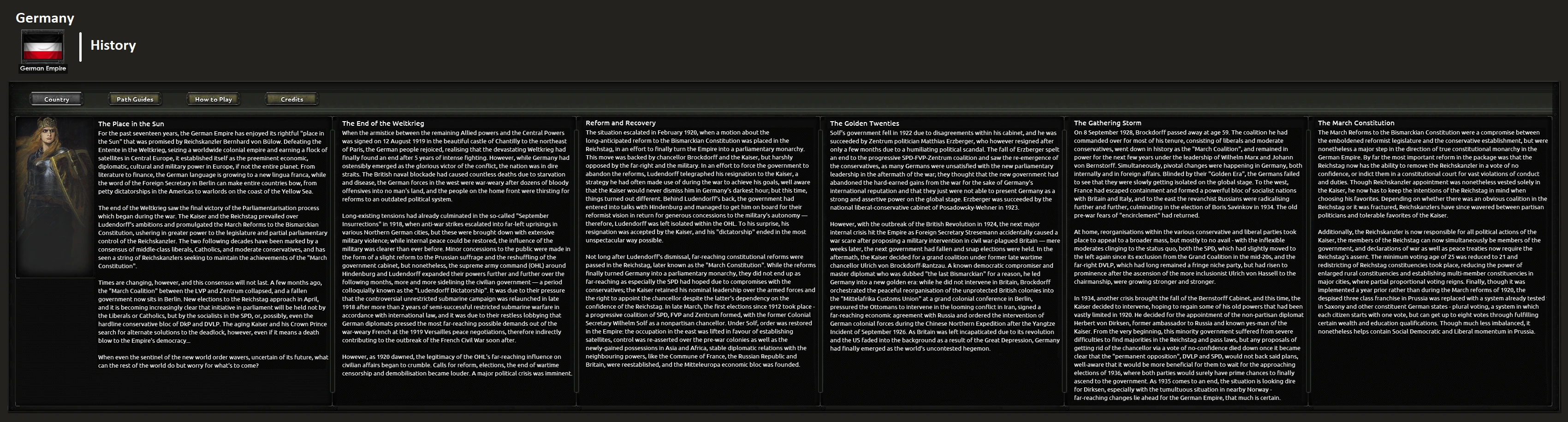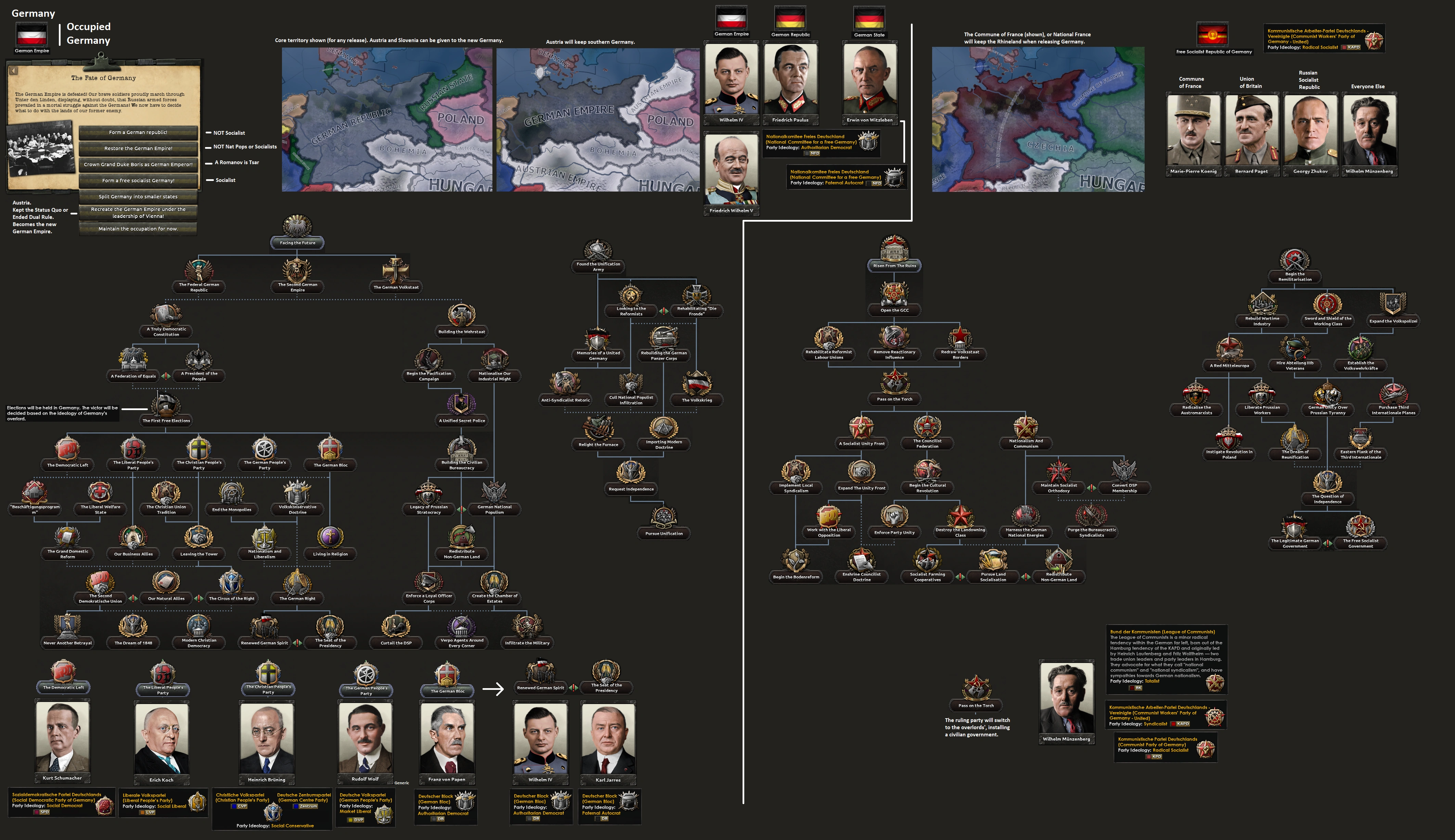 Germany has special content with three nations it can occupy: The Russian Republic, Commune of France, and the Union of Britain. Concerning the Union of Britain, only it as a whole or England will be part of the unique content. Scotland and Wales do have puppet content but not unique to Germany. All of this will play out through the left branch of the Post-War Tree, starting with the Woe to the Vanquished focus.