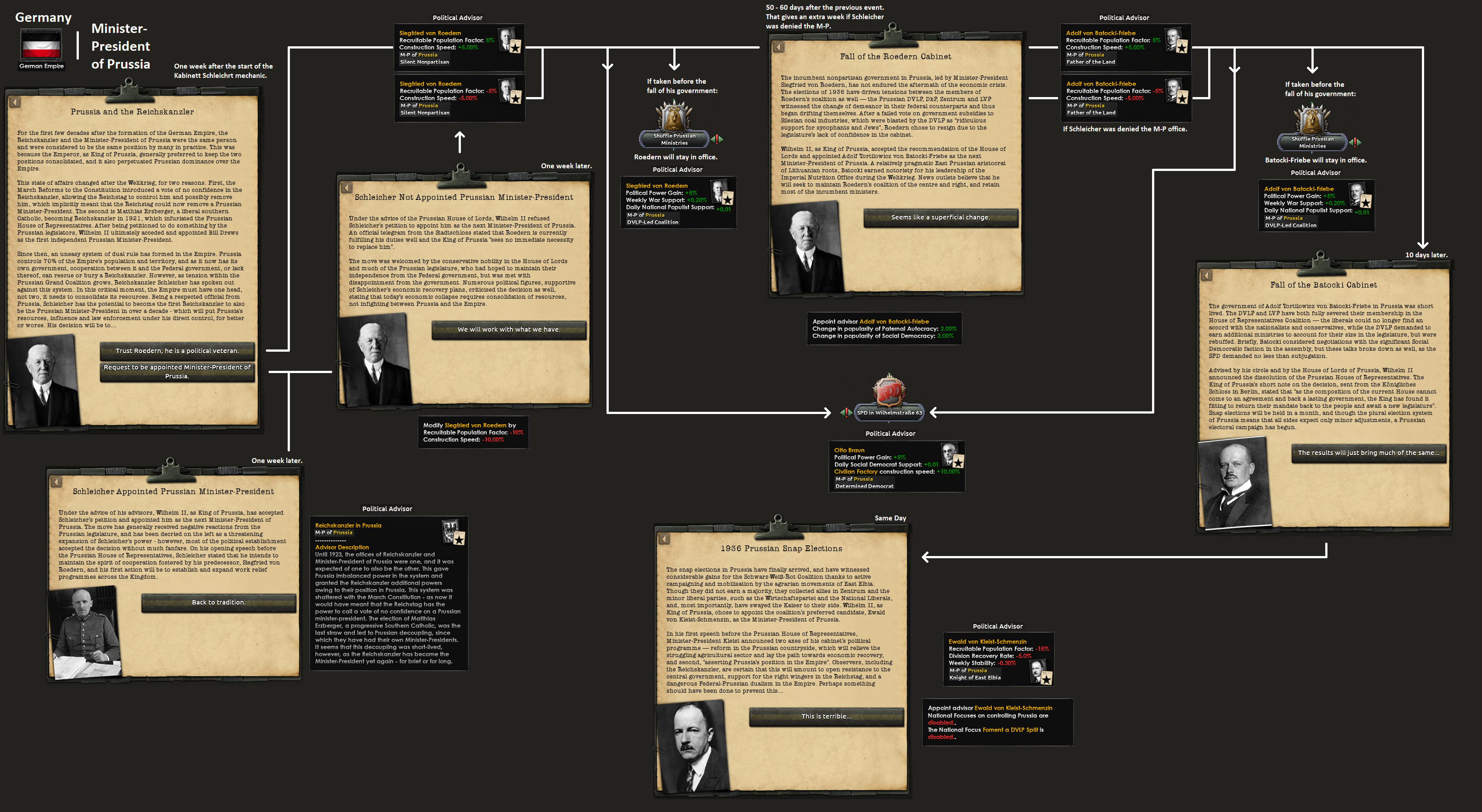 At any time before Kleist-Schmenzin takes over, if the focus Reshuffle Prussia Ministries is completed, the M-P at the time (Roedern or Batocki-Friebe) will stay in office and will not be removed. If the focus SPD in Wilhelmstraße 63 (the address of the Prussian State Ministry, the Cabinet) is completed instead, Otto Braun, a member of the SPD, will be appointed the new M-P, and will likewise not be able to be removed.