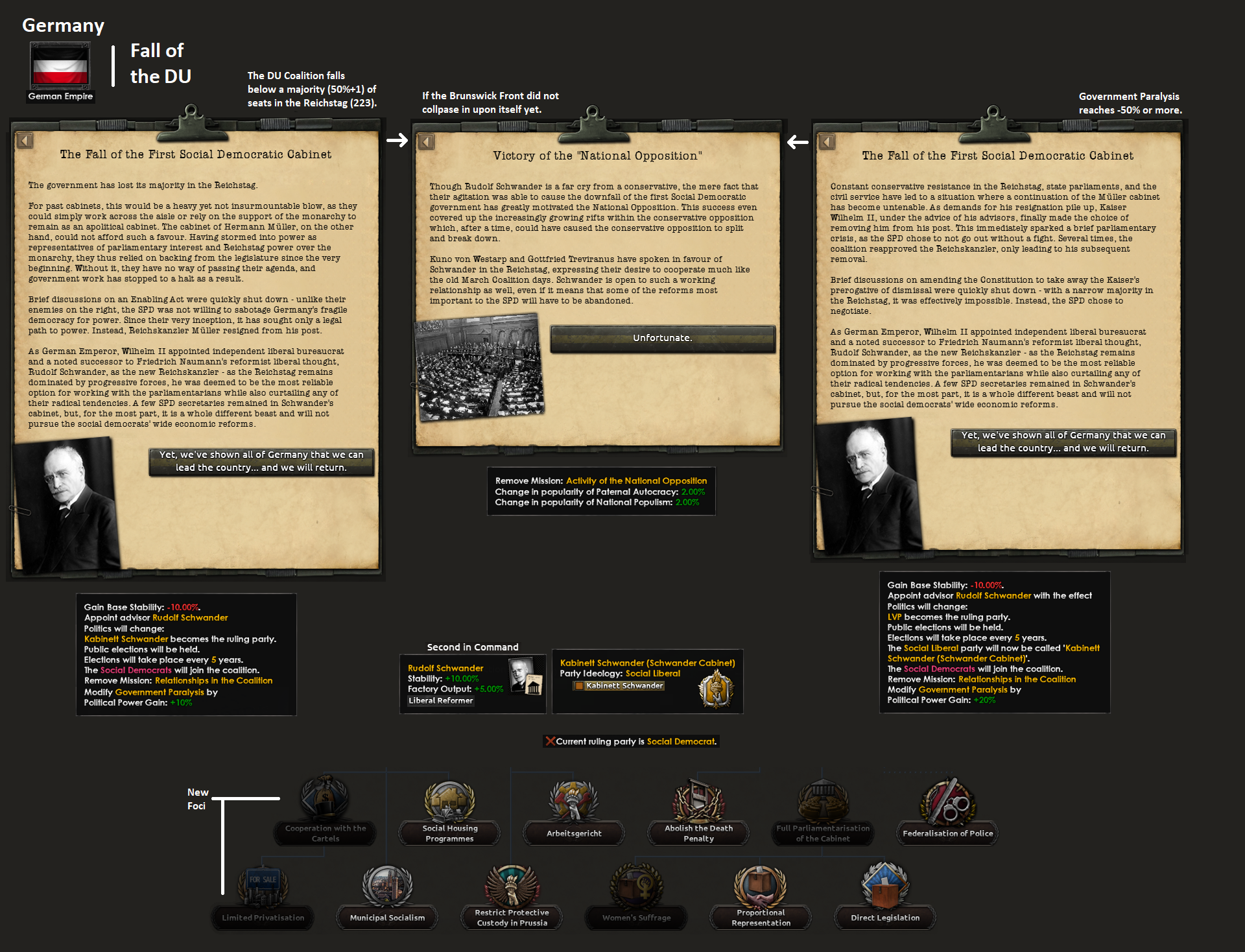 In either case, Rudolf Schwander (as head of the soc lib LVP) will be appointed Chancellor in his place. Though he retains some SPD members in his Cabinet, he is not as radical as those in the SPD. A number of foci will be locked due to the change in government. This will be a win for the ‘National Opposition’ (if it did not collapse) as it got what it wanted, the removal of Müller and the SPD.