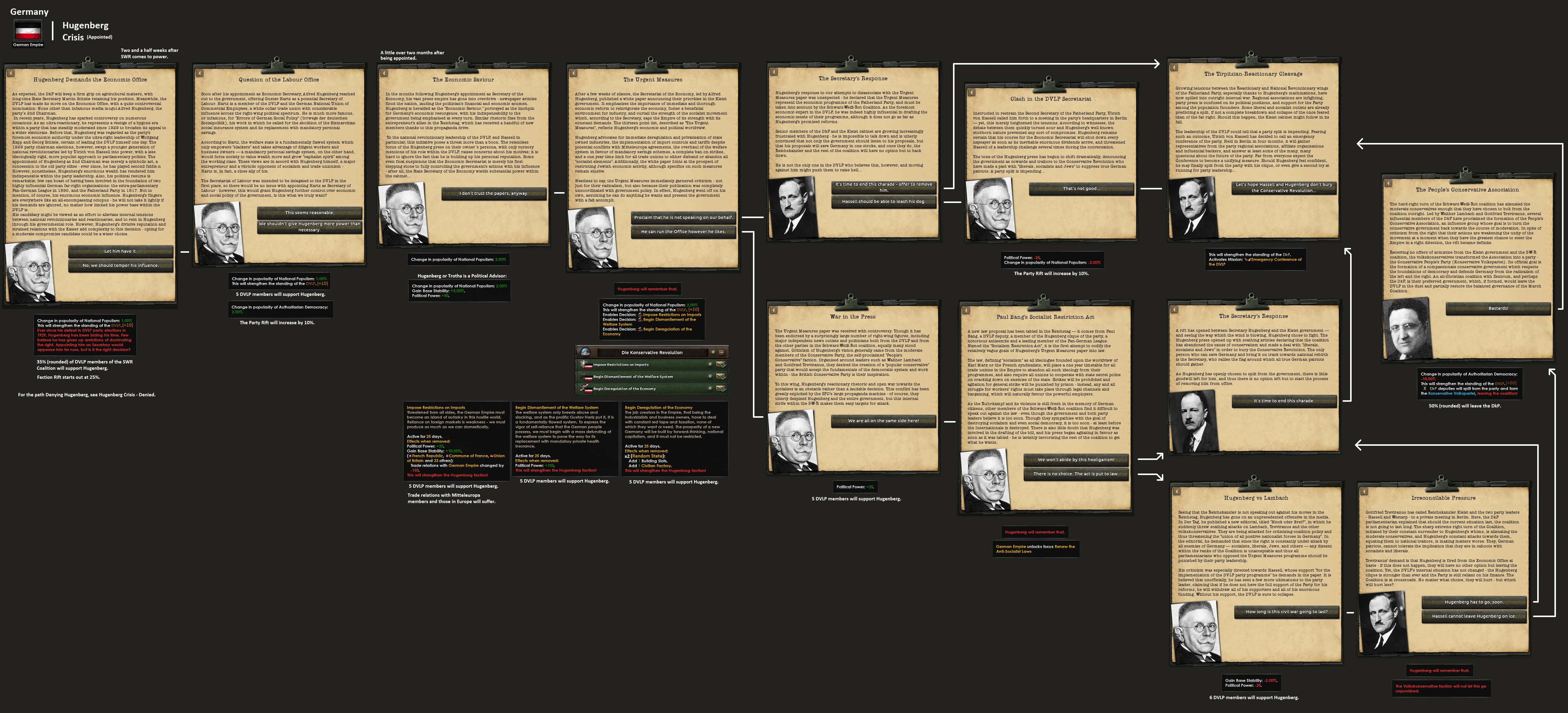 Through the left-most branch, Germany can support the US in the runup to its eventual civil war. Once the war does break out, with America occupied for the foreseeable future, Germany can court the leaders of Central and South America, each with varying prerequisites, to join its faction, the Reichspakt.