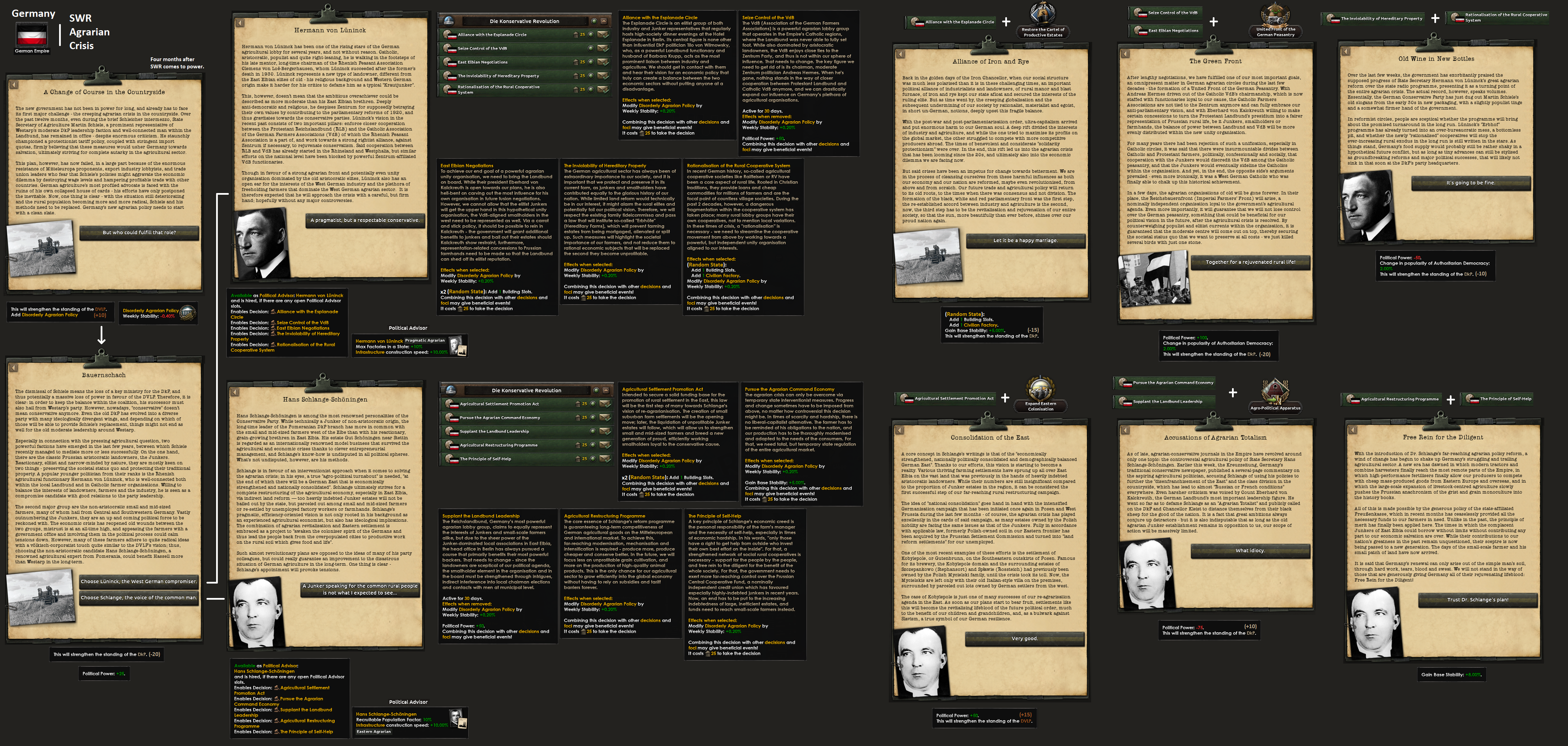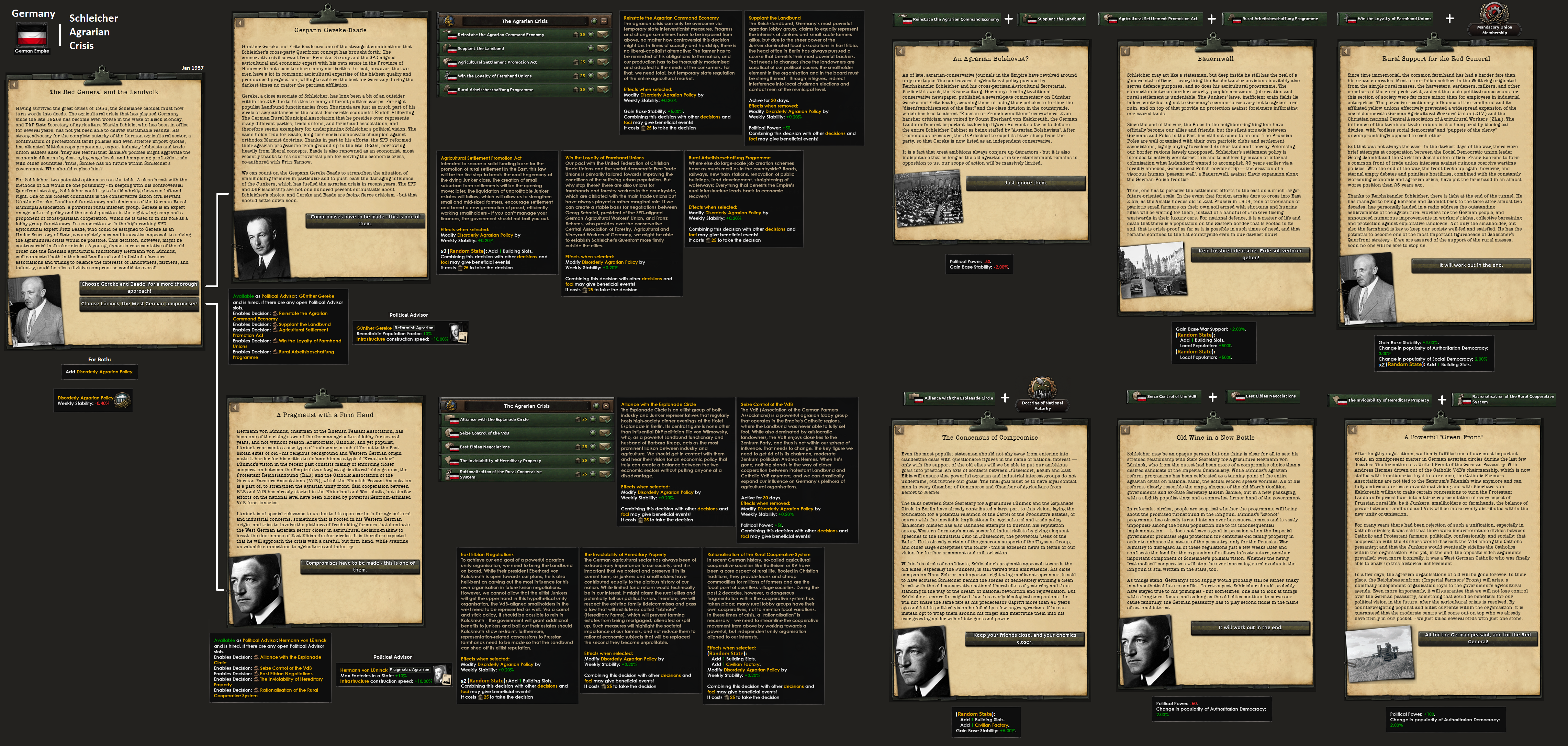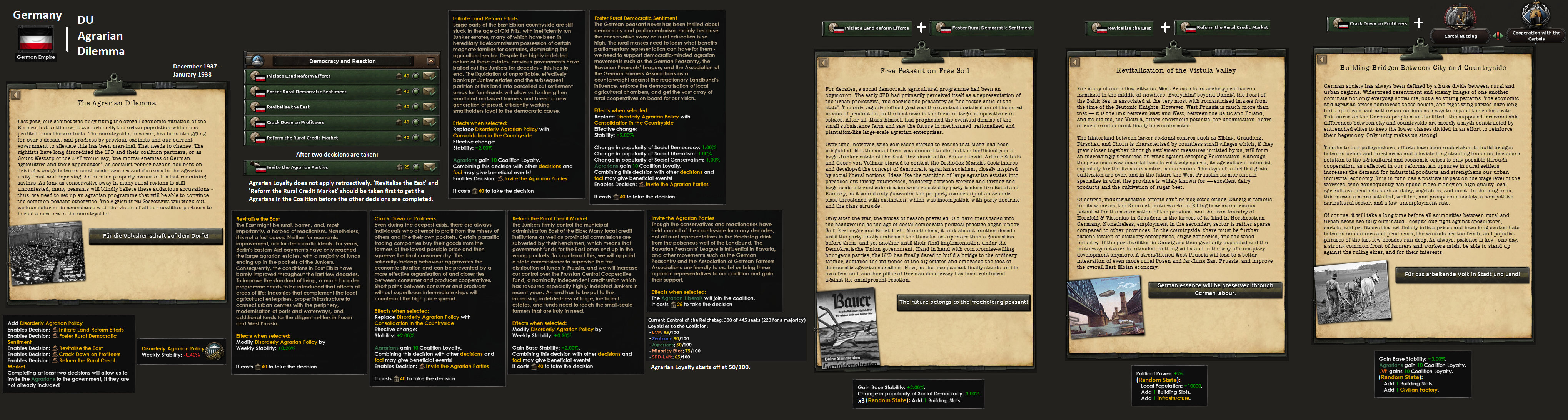 Five decisions to alleviate the effects of a previous disorderly agrarian policy will become available. Certain decisions, when completed with each other or a focus from the DU’s political tree, will trigger associated events.