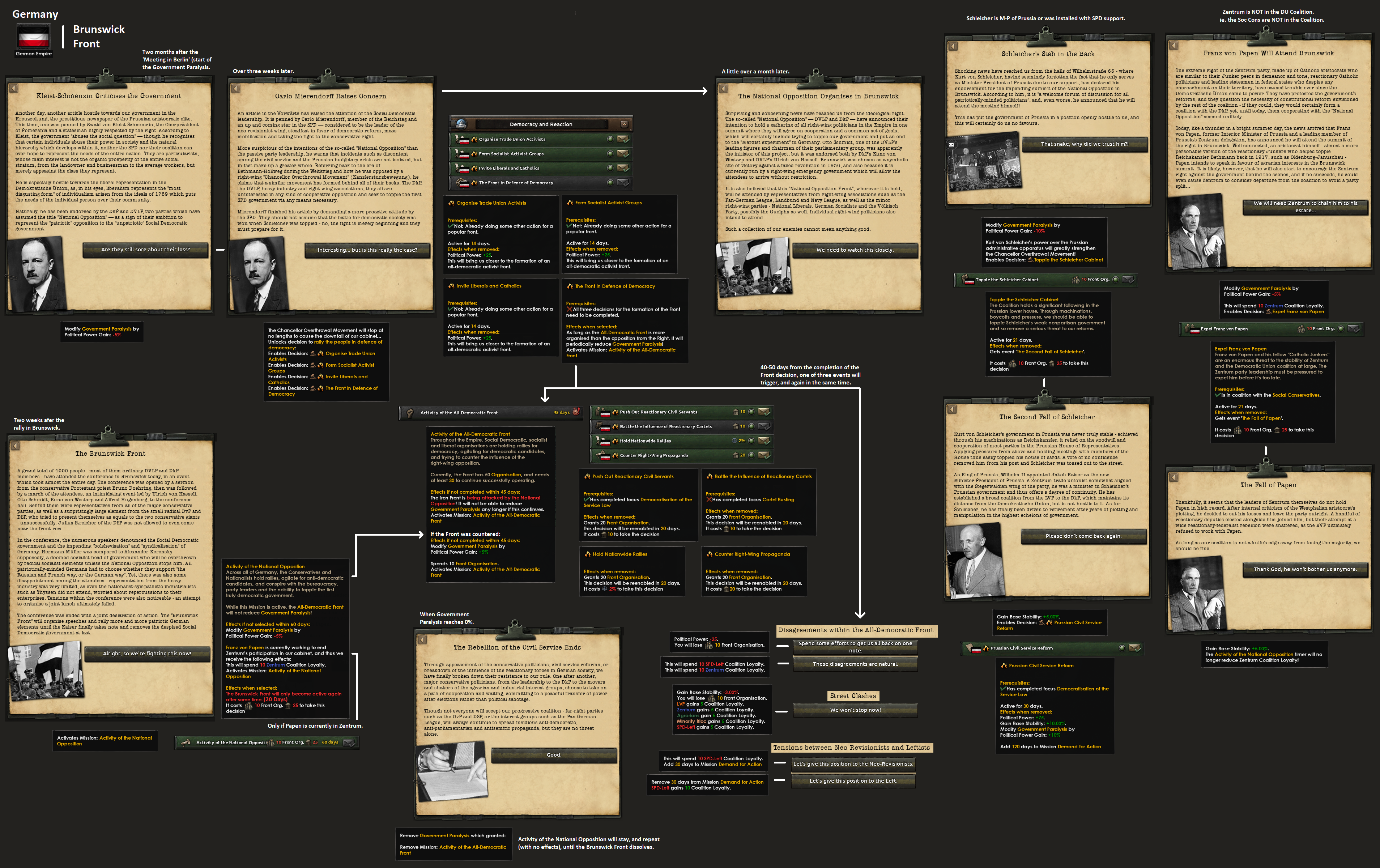 Every 60 days the Brunswick Front will go on the attack, and must be countered before then by selecting the mission Activity of the National Opposition. 20 days later the Front will become active again and must be countered before the next 60 days. If the Front is left to attack, Government Paralysis will increase by -5% (and Zentrum Loyalty will decrease by 10 if Papen is still a member), but if it is countered, the Activity of the All-Democratic Front will decrease Government Paralysis by 5%.
