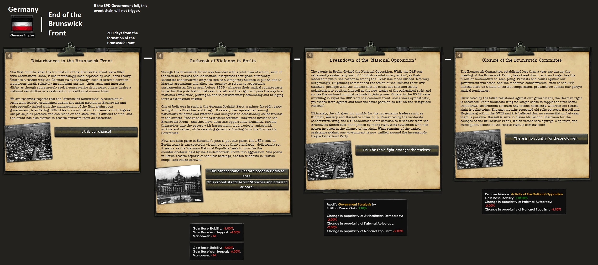 Owing to the infighting that has kept the German right fractured, the Brunswick Front will not last long. A little under six months from the formation of the Front, deep, deep division will start to appear, and it will get so bad the DkP will withdraw from the ‘National Opposition’. The DkP will no longer seek to radically overthrow the DU as hardliners in the right would like, and the DVLP will split at the seams with infighting between Chairman Hassell and 2nd Chairman Hugenberg getting out of control. The Front will collapse, and the Activity of the National Opposition mission will be removed. (If the DU Government collapsed, this event chain will not trigger and the mission will be removed after the collapse event.)