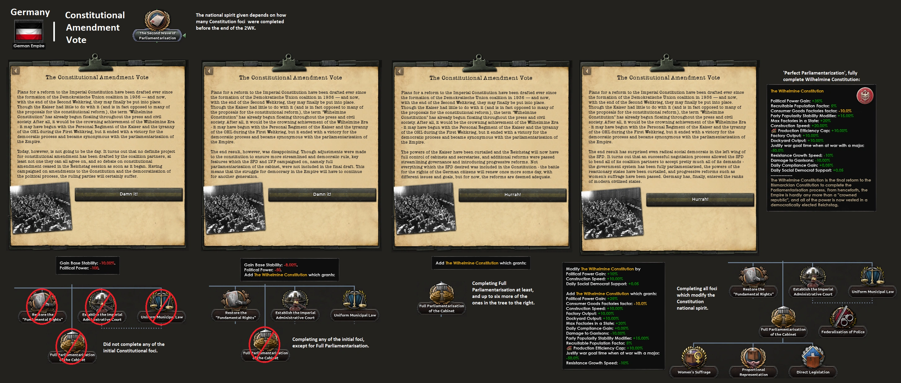 Once the 2WK has been won, the government can unveil the changes to the Constitution. There are four outcomes, depending on how many of the Constitutional foci were completed. All but the first will give the Wilhelmine Constitution national spirit, the effects depending on which foci were completed: