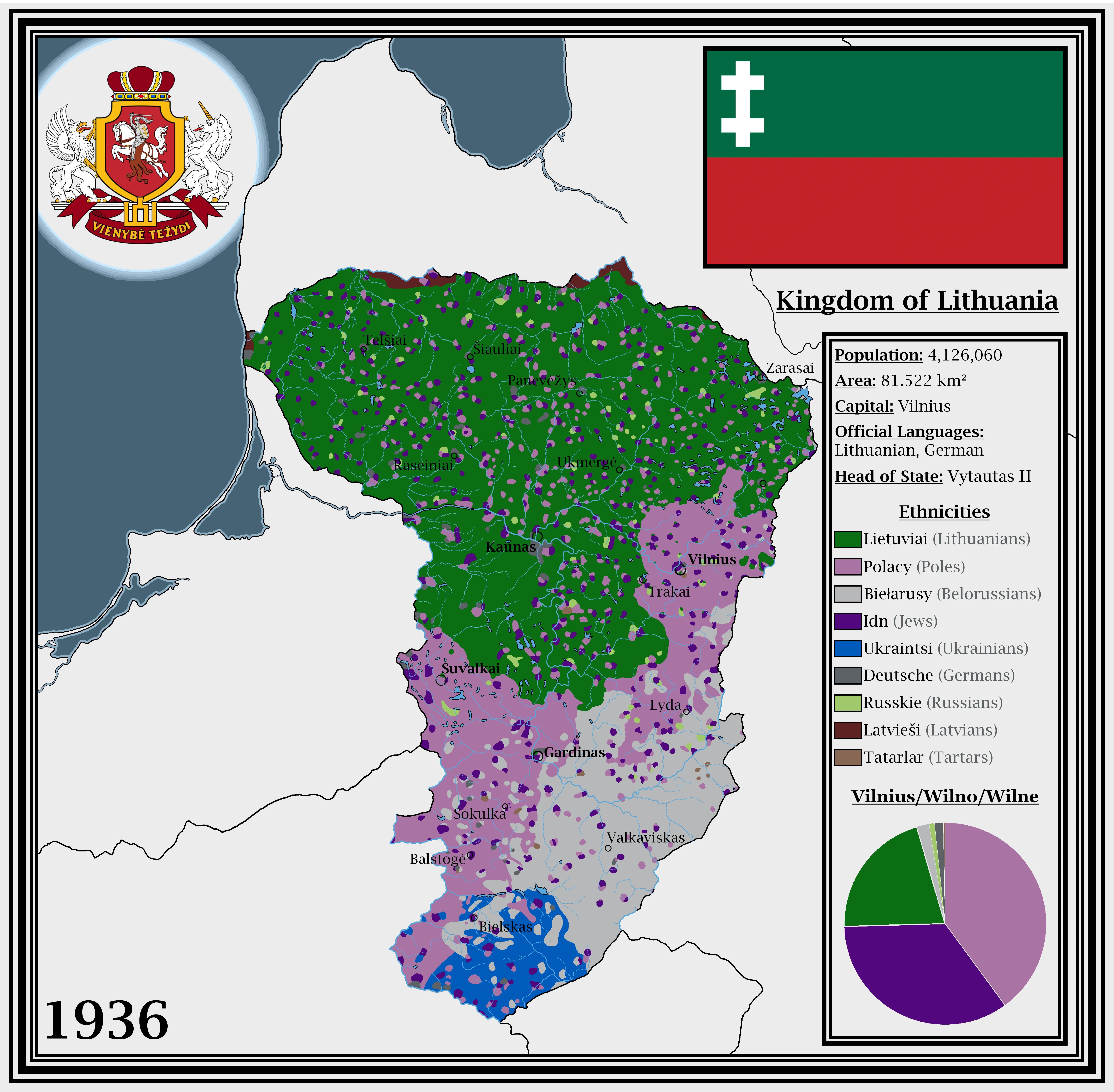 The Kingdom of Lithuania is the homeland of ethnic Lithuanians, with only a small portion of them living outside the Kingdom’s borders in Lithuania Minor. However, due to the large portions of territory awarded to Lithuania by Germany after the war, ethnic Lithuanian constitute only a slim majority of the population. Poles, Belarusians, and Jews are only the three largest of the many minority groups, and are particularly concentrated in “Outer Lithuania”, the poorer region south of Vilnius. The majority religion is Roman Catholicism, with Eastern Orthodox, Eastern Catholic, and Jewish minorities.